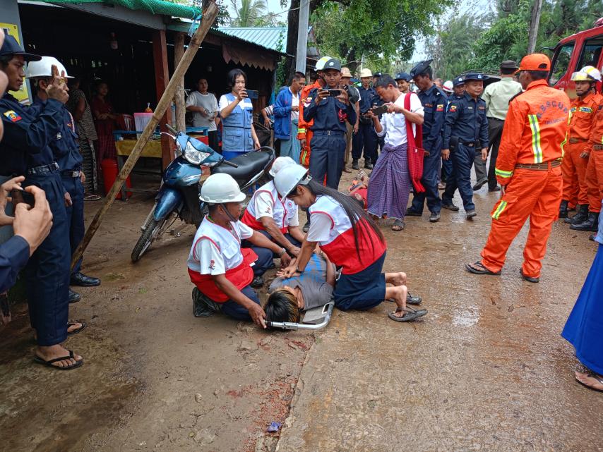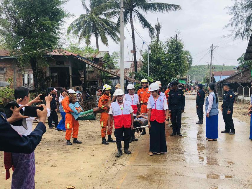 ထို့နောက် မုန်တိုင်းဘေးအန္တရာယ်ကြိုတင်ကာကွယ်ရေးသဏ္ဌာန်တူ ဇာတ်တိုက်လေ့ကျင့်ခြင်းဆောင်ရွက်ရာ ရှေးဦးစွာ မြို့နယ်မီးသတ်ဦးစီးမှူး ဦးအောင်ကျော်ထွေးက မုန်တိုင်းဘေးအန္တရာယ်နှင့်ပတ်သက်သည့် မုန်တိုင်းမဖြစ်မီ၊ ဖြစ်ပွားနေစဥ်နှင့် ဖြစ်ပွားပြီးအချိန်တို့တွင် ဆောင်ရွက်ရမည့်အရောင် အမှတ်အသားအလံများဖြင့် ရှင်းလင်းပြသခြင်း၊ ဘေးအန္တရာယ်ကြုံတွေ့လာပါက ပြင်ဆင်ရန်လိုအပ်သည့် ဆောင်ရန်ရှောင်ရန်အချက်များ၊ ဘေးအန္တရာယ်ကျရောက်လာပါက ရှာဖွေကယ်ဆယ်ရေးလုပ်ငန်းများ ဆောင်ရွက်ရမည့်အခြေအနေများကို ရှင်းလင်းပြောကြားပြီး၊ မြို့နယ်မီးသတ်ဦးစီးဌာန၊ မြို့နယ်ဘေးအန္တရာယ်ဆိုင်ရာစီမံခန့်ခွဲမှုဦးစီးဌာနနှင့် မြို့နယ်ကြက်ခြေနီတပ်ဖွဲ့ဝင်တို့မှ မုန်တိုင်းဘေးအန္တရာယ်ဖြစ်ပေါ်လာပါက ဆောင်ရွက်ရမည့်လုပ်ငန်းများအား သရုပ်ပြခြင်း၊ ရှာဖွေကယ်ဆယ်ခြင်း၊ လူနာများအား ရှေးဦးပြုစုပြီး ဆေးရုံသို့ပို့ဆောင်ခြင်းများကို သဏ္ဌာန်တူဇာတ်တိုက်လေ့ကျင့်ခြင်းများ ဆောင်ရွက်ခဲ့ကြကြောင်း သိရသည်။