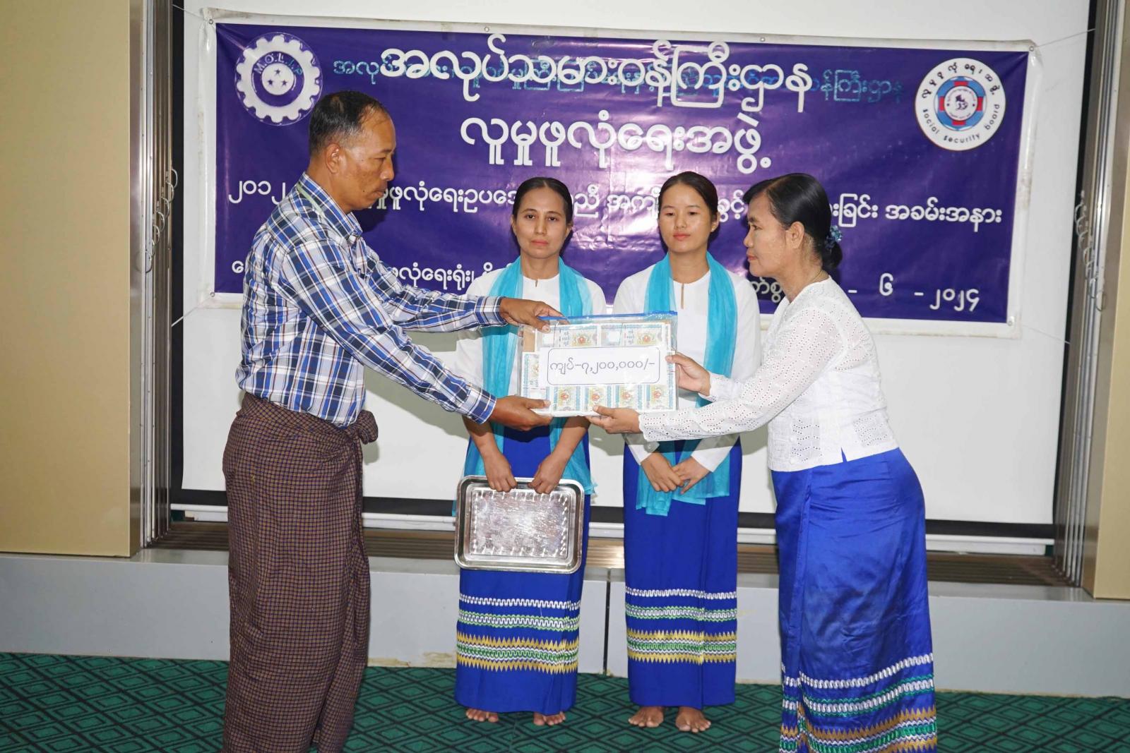 အခမ်းအနားတွင် မန္တလေးတိုင်းဒေသကြီး၊ လူမှုဖူလုံရေးရုံးမှ တိုင်းဒေသကြီးတာဝန်ခံအရာရှိ ဒုတိယညွှန်ကြားရေးမှူး ဒေါ်ကြည်ကြည်ထွန်းက ၂၀၁၂ ခုနှစ် လူမှုဖူလုံရေး ဥပဒေအကြောင်း သိကောင်း စရာများဖြစ်သည့် အာမခံအလုပ်သမားများအကြောင်း၊ မကျန်းမာမှုအတွက် ဆေးကုသမှုခံယူခွင့်၊ မကျန်းမာမှုအတွက် ငွေကြေးအကျိုးခံစားခွင့်၊ ကိုယ်ဝန်ဆောင်မှုနှင့် မီးဖွားမှုအတွက် ဆေးကုသမှု၊ ငွေကြေးခံစားခွင့်နှင့် မီးဖွားစရိတ်ခံစားခွင့်၊ အာမခံအလုပ်သမားသေဆုံးလျှင် နာရေးစရိတ်ခံစားခွင့်၊ အလုပ်တွင်ထိခိုက်မှုကြောင့် အမြဲတမ်းမသန်စွမ်းမှု ငွေကြေးအကျိုးခံစားခွင့် စသည့်အကြောင်းအရာများကို ရှင်းလင်းပြောကြားခဲ့သည်။ ယင်းနောက် ဒုတိယညွှန်ကြားရေးမှူး ဒေါ်ကြည်ကြည်ထွန်းက မိတ္ထီလာမြို့နယ် လူမှုဖူလုံရေးရုံးတွင် အကျုံးဝင်မှတ်ပုံတင်ထားသော တပ်မတော်ချည်မျှည်နှင့် အထည်စက်ရုံမှ လုပ်ငန်းခွင်ပြင်ပတွင် ထိခိုက်မှုကြောင့် သေဆုံးခြင်းအတွက် ကျန်ရစ်သူ အကျိုး ခံစားခွင့် ငွေကျပ် ၇၂ သိန်းကို အာမခံအလုပ်သမား မမျိုးသန္တာ၏ ဖခင် ဦးစိုးနိုင်အား ပေးအပ်ခဲ့ရာ တပ်မတော်ချည်မျှည်နှင့် အထည်စက်ရုံမှ ဒုတိယစက်ရုံမှူး ဒေါ်စုစုဝင်းက ကျေးဇူးတင်စကား ပြန်လည်ပြောကြားခဲ့သည်။
