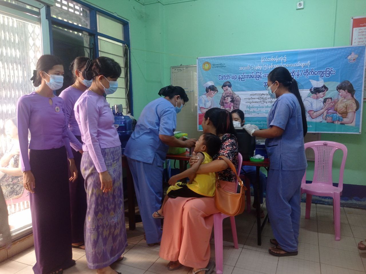 အဆိုပါ Catch-up နည်းလမ်းဖြင့် ကာကွယ်ဆေးထိုးနှံ/တိုက်ကျွေးခြင်း ဆောင်ရွက်ရာတွင် အသက် (၁)နှစ်မှ (၅)နှစ်အရွယ်ကလေးများအနက် ကာကွယ်ဆေးအကြိမ်ပြည့် မထိုးနှံရသေးသော ကလေးငယ်များနှင့် ကာကွယ်ဆေးတစ်ကြိမ်မျှမရရှိသေးသော ကလေးငယ်စုစုပေါင်း (၁၀၅)ဦးအား မြို့နယ်ကျန်းမာရေးဦးစီးမှူး ဒေါက်တာနန်းလှထွန်း၏ ကြီးကြပ်မှုဖြင့် မြို့နယ်ပြည်သူ့ကျန်းမာရေးဦးစီးဌာနမှ ဝန်ထမ်းများက ငါးမျိုးစပ်ကာကွယ်ဆေး၊ ဝက်သက်-ဂျိုက်သိုးရောဂါကာကွယ်ဆေးနှင့် ပိုလီယိုရောဂါကာကွယ်ဆေးစသည်တို့ကို ယနေ့တွင် ထိုးနှံတိုက်ကျွေးပေးခြင်းဖြစ်ကြောင်း မြို့နယ်ကျန်းမာရေး ဦးစီးဌာနမှ သိရသည်။