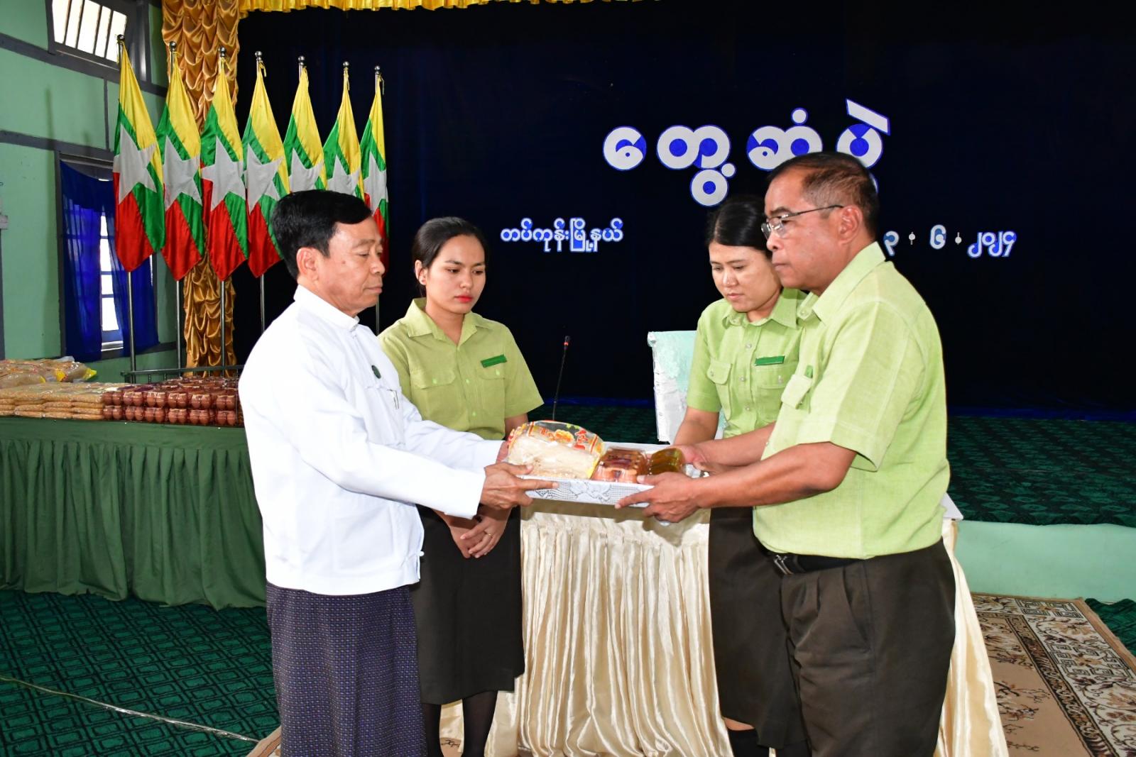 ယင်းနောက် နေပြည်တော်ကောင်စီဥက္ကဋ္ဌနှင့် နေပြည်တော်ကောင်စီဝင်များ၊ နေပြည်တော် ကောင်စီ အတွင်းရေးမှူးတို့က တက်ရောက်လာကြသည့် တောင်သူများအား နိုင်ငံ့စီးပွားမြှင့်တင်ရေးစီမံကိန်းမှ မိုးစပါးအတွက် ဓာတ်မြေဩဇာများကို ပေးအပ်သည်။