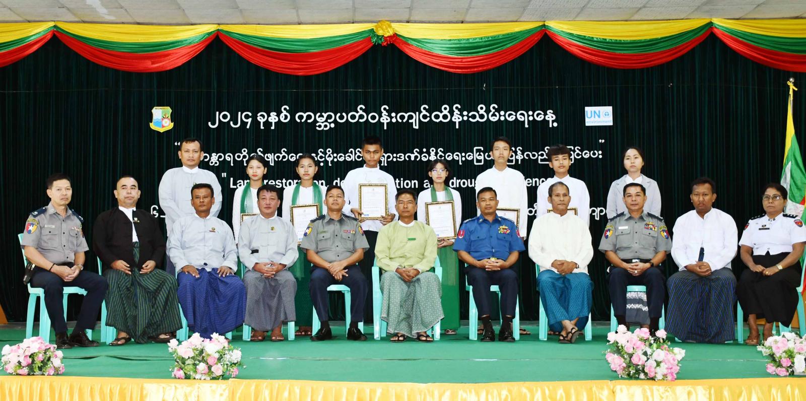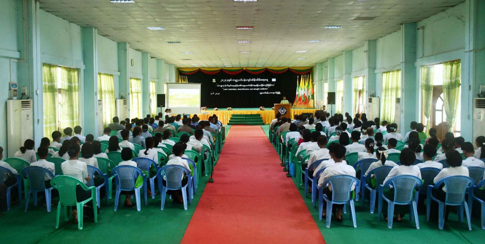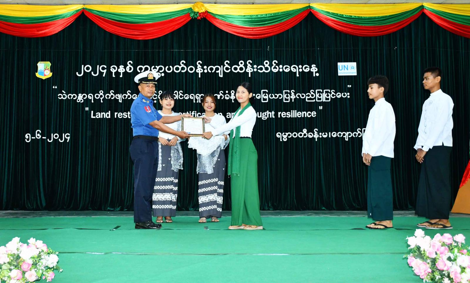 ၂၀၂၄ ခုနှစ်၊ ဇွန်လ (၅) ရက်နေ့တွင် ကျရောက်သည့် ကမ္ဘာ့ပတ်ဝန်းကျင်ထိန်းသိမ်းရေးနေ့ “သဲကန္တာရတိုက်ဖျက်ရေးနှင့် မိုးခေါင်ရေရှား ဒဏ်ခံနိုင်ရေး မြေယာပြန်လည်ပြုပြင်ပေး” အထိမ်းအမှတ် အခမ်းအနားကို ယနေ့ နံနက်ပိုင်းက အစိုးရရပ်ကွက်ရှိ ရမ္မာဝတီခန်းမ၌ ကျင်းပပြုလုပ်ရာ ခရိုင်စီမံအုပ်ချုပ်ရေးအဖွဲ့ဥက္ကဋ္ဌနှင့် အဖွဲ့ဝင်များ၊ ခရိုင်/မြို့နယ်အဆင့် ဌာနဆိုင်ရာများ၊ ပတ်ဝန်းကျင်ထိန်းသိမ်းရေးဦးစီးဌာနမှ ခရိုင်ဦးစီးမှူးနှင့် ဝန်ထမ်းများ၊ ဆရာ၊ဆရာမများနှင့် ဆုရကျောင်းသား၊ကျောင်းသူများ တက်ရောက်ကြသည်။