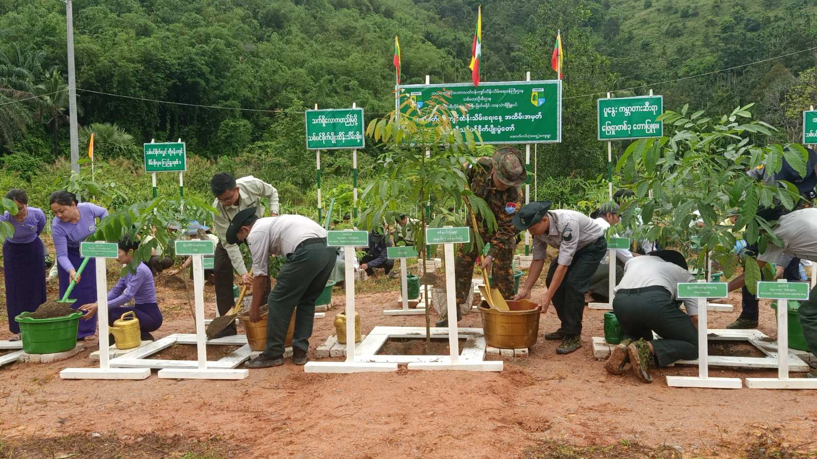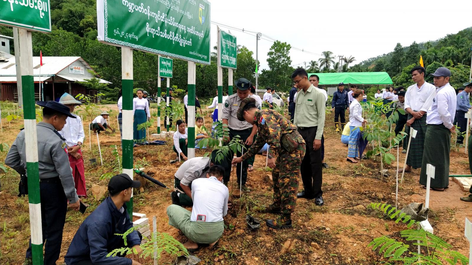 ထို့နောက် အမှတ်(၂)စစ်နယ်မြေမှူး၊ မြို့နယ်စီမံအုပ်ချုပ်ရေးအဖွဲ့ဥက္ကဋ္ဌနှင့်အဖွဲ့ဝင်များ၊ မြို့နယ်ဌာနဆိုင်ရာဝန်ထမ်းများ၊ ဆရာ/မများ ကျောင်းသူ/ ကျောင်းသားများ စုစုပေါင်း အင်အား(၂၀၀)ဦးခန့်တို့က ကြိုတင်သတ်မှတ်ထားပေးသည့် နေရာအသီးသီး၌ ပျဉ်းကတိုးပင် (၁၀၀)ပင်၊ စိန်ပန်း(၆၀)ပင်၊ မဟော်ဂနီ(၈၀)ပင်၊ ခရေပျိုးပင်(၇၀)ပင်၊ မန်ဂျန်ရှား(၆၀)ပင်၊ ကံ့ကော်ပင်(၅၀)ပင် ပျိုးပင် စုစုပေါင်း (၄၂၀)ပင်ကို မြို့နယ်သစ် တောဦးစီးဌာနဝန်ထမ်းများ၏ ပေါင်းစပ်ကူညီမှုဖြင့် တပျော်တပါး ပါဝင်ဆင်နွှဲ၍ စိုက်ပျိုးပေးကြကြောင်း သိရှိရသည်။