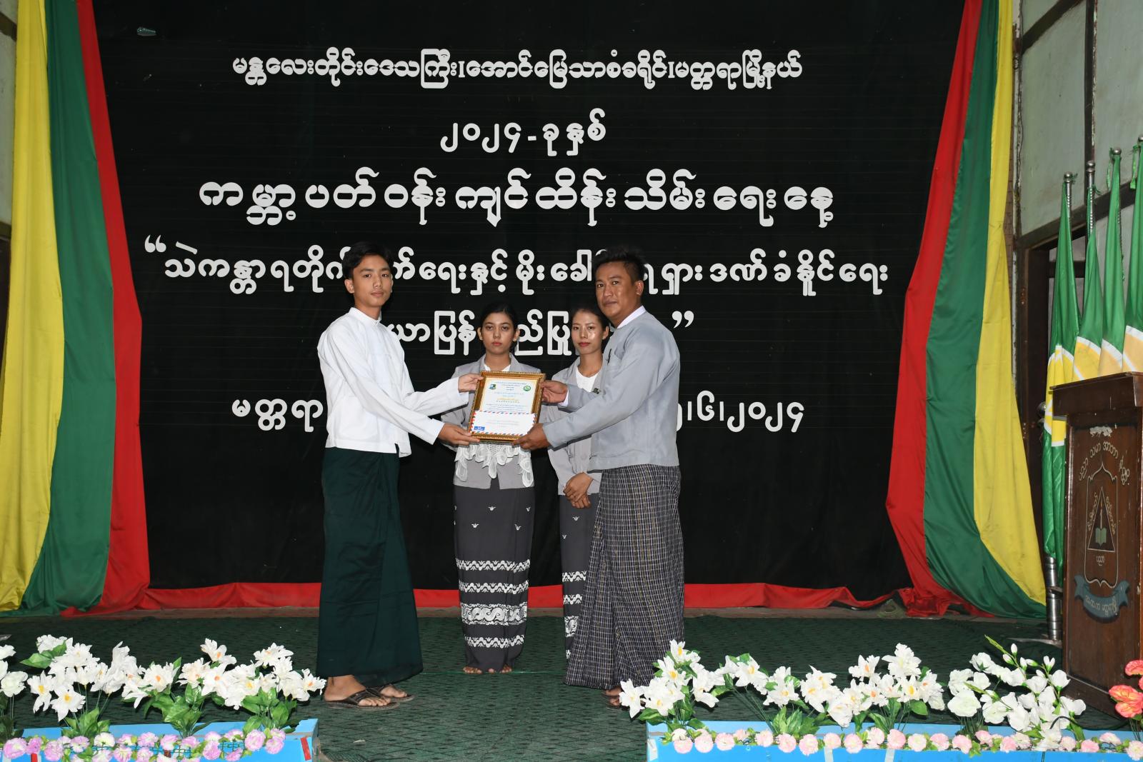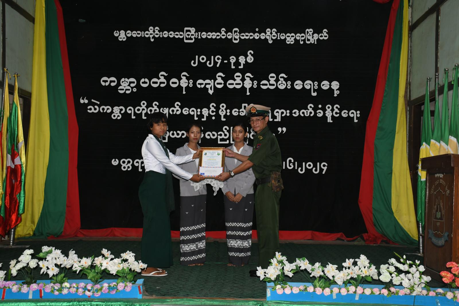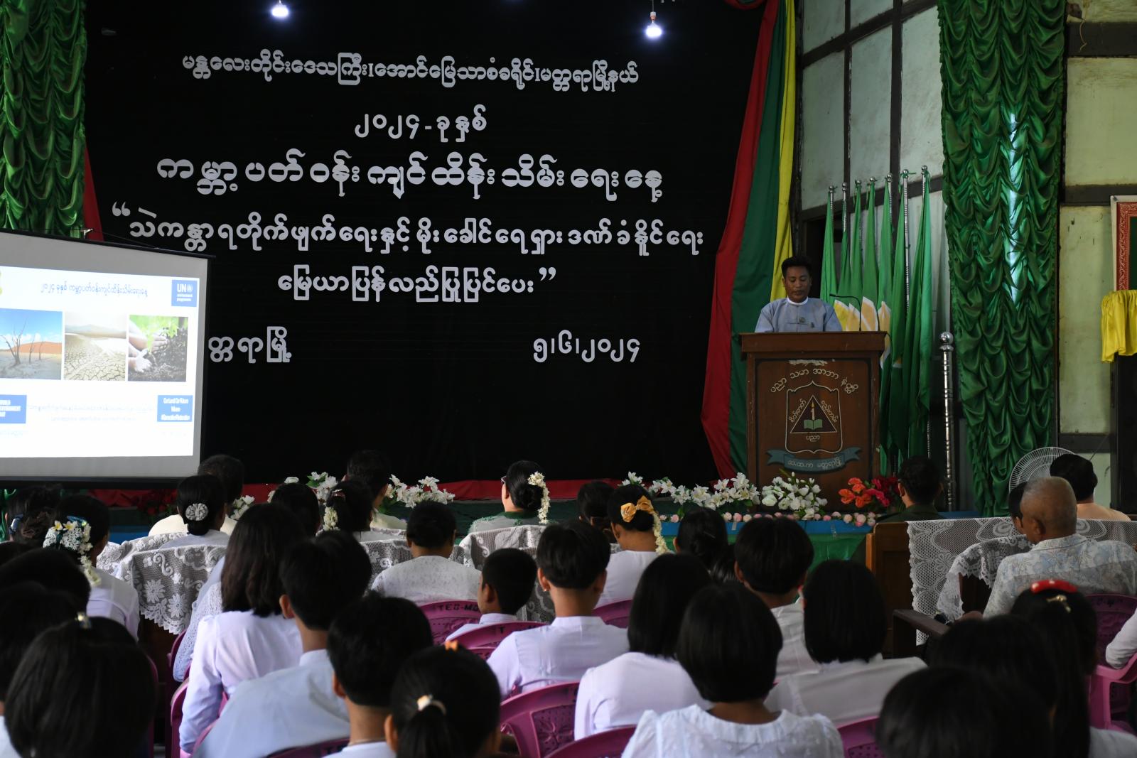 ရှေးဦးစွာ မြို့နယ်စီမံအုပ်ချုပ်ရေးအဖွဲ့ဥက္ကဋ္ဌကိုယ်စား အဖွဲ့ဝင်(၁) ဗိုလ်မှူးသန်းဝင်းအောင်မှ အဖွင့်အမှာစကားပြောကြားခဲ့ပြီး ပတ်ဝန်း ကျင်ထိန်းသိမ်းရေးဦးစီးဌာန ဦးစီးအရာရှိ ဦးလှိုင်ဝင်းသန်းမှ“ သဲကန္တာရတိုက်ဖျက်ရေးနှင့် မိုးခေါင်ရေရှားဒဏ်ခံနိုင်ရေး မြေယာပြန်လည်ပြုပြင်ပေး” ခေါင်းစဉ်ဖြင့် အသိပညာပေးဟောပြောခဲ့သည်။ ထို့နောက် တက်ရောက်လာကြသူများအား ကမ္ဘာ့ပတ်ဝန်းကျင် ထိန်းသိမ်းရေးနေ့အကြောင်း အသိပညာပေး Video Clip များကို ပြသခဲ့သည်။ ဆက်လက်၍ ကမ္ဘာ့ပတ်ဝန်းကျင်ထိန်းသိမ်းရေးနေ့အထိမ်းအမှတ် အထက်တန်းအဆင့်နှင့် အလယ်တန်းအဆင့် စာစီစာကုံးပြိုင်ပွဲများနှင့် မူလတန်းအဆင့်ဆေးရောင်ခြယ်ပြိုင်ပွဲတွင် ဆုရှိသူများအား မြို့နယ်စီမံ အုပ်ချုပ်ရေးအဖွဲ့ အဖွဲ့ဝင်များနှင့် ဌာနဆိုင်ရာတာဝန်ရှိသူများမှ ဆုများပေးအပ်ချီးမြှင့်ခဲ့ကြသည်။