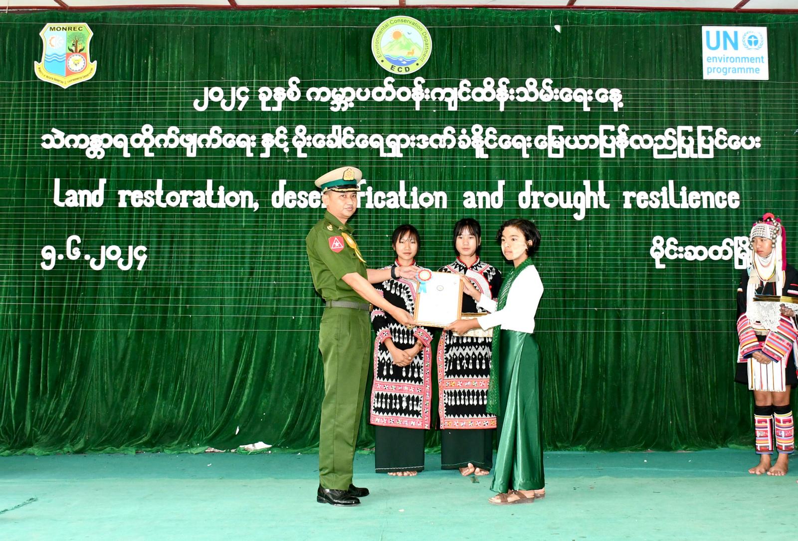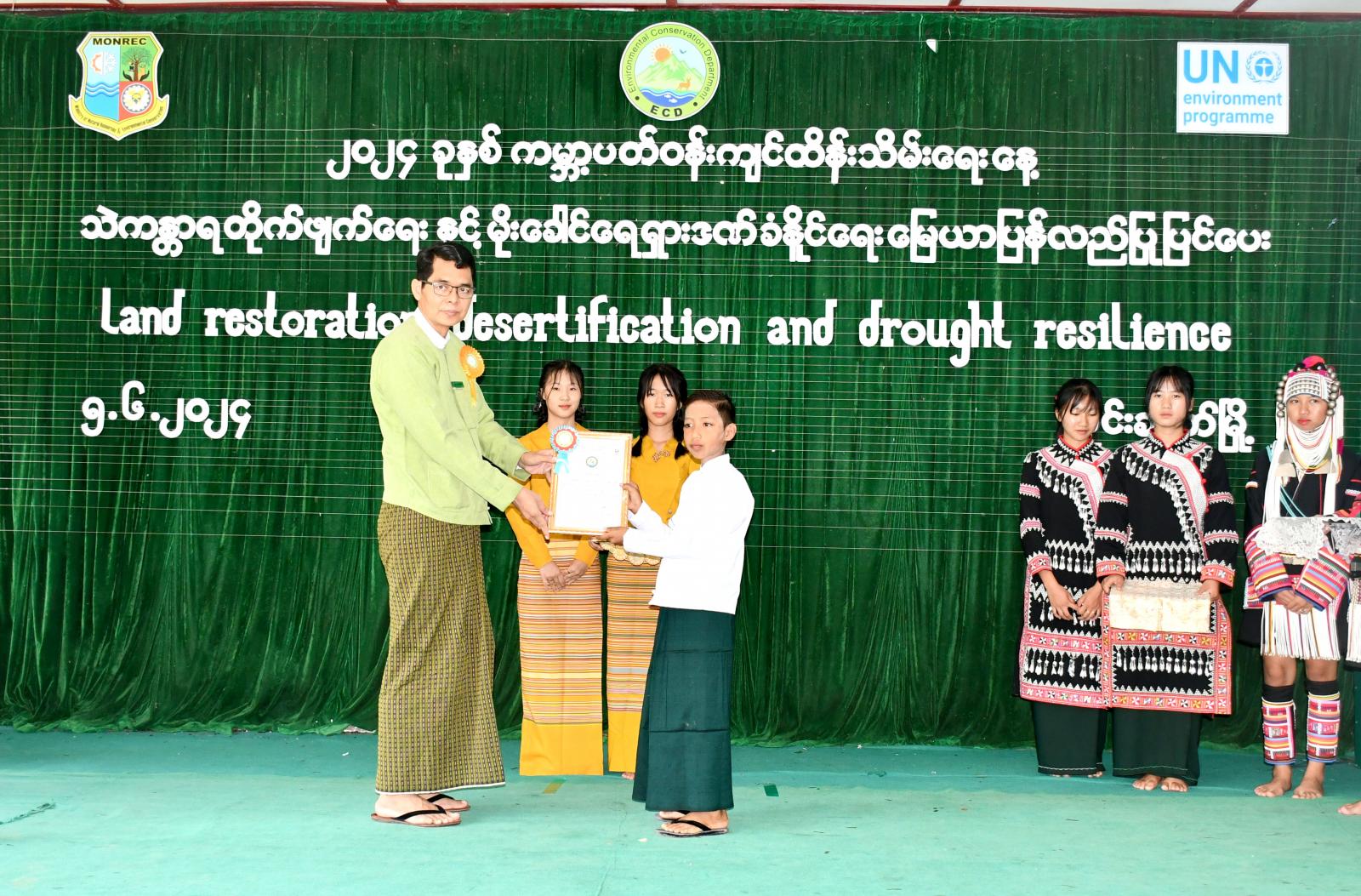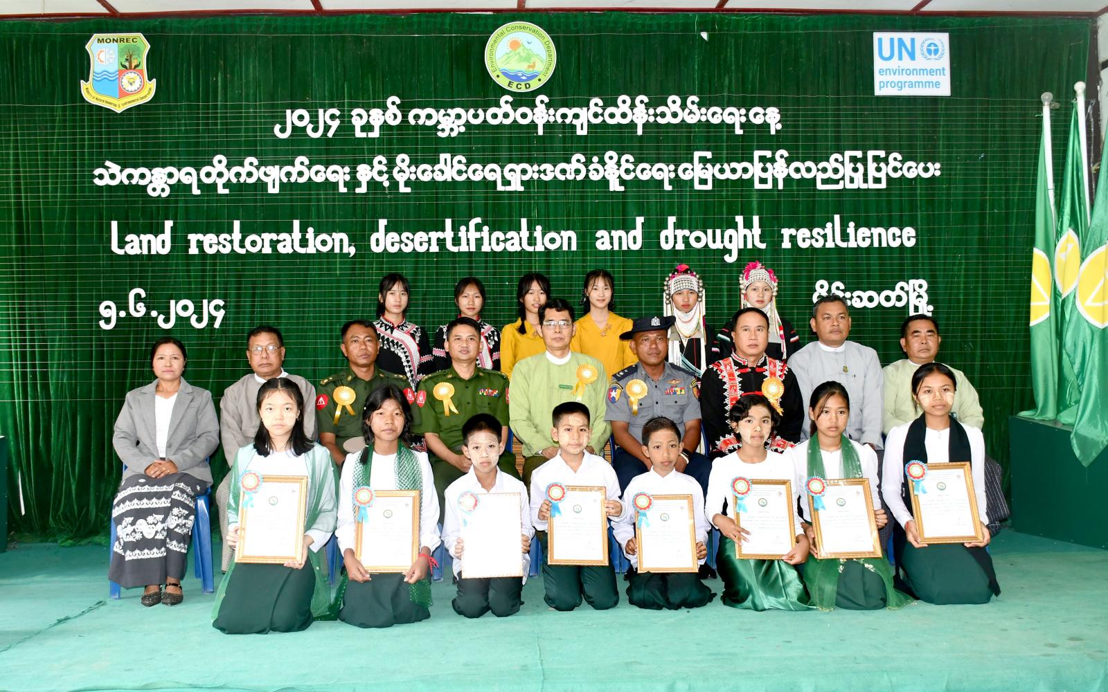 ထို့နောက် ခရိုင်စီမံအုပ်ချုပ်ရေးအဖွဲ့ဥက္ကဋ္ဌ ဦးညီညီထွေး၊ အမှတ်(၁၄)စစ်ဆင်ရေးကွပ်ကဲမှုဌာနချုပ်မှ ယာယီနည်းဗျူဟာမှူး ဒုတိယဗိုလ်မှူးကြီး ဝင်းကျော်သန့်၊ ရှမ်းပြည်နယ်၊ ပတ်ဝန်းကျင်ထိန်းသိမ်းရေးဦးစီးဌာနမှ ဒုတိယညွှန်ကြားရေးမှူး ဦးမော်မော်ကိုနှင့် တာဝန်ရှိသူတို့က ကမ္ဘာ့ပတ်ဝန်းကျင်ထိန်းသိမ်းရေးနေ့အထိမ်းအမှတ် အခြေခံပညာအလယ်တန်းအဆင့် စာစီစာကုံးပြိုင်ပွဲနှင့် မူလတန်းအဆင့် ပန်းချီပြိုင်ပွဲတွင် ဆုရရှိသည့် ကျောင်းသား၊ ကျောင်းသူများကို ဂုဏ်ပြုမှတ်တမ်းနှင့် ဂုဏ်ပြုဆုငွေများပေးအပ်ရာ ဆုရရှိသည့် ကျောင်းသား၊ ကျောင်းသူများက လက်ခံရယူကာ စုပေါင်းမှတ်တမ်းဓာတ်ပုံများ ရိုက်ကူးခဲ့ကြပြီး ကမ္ဘာ့ပတ်ဝန်းကျင်ထိန်းသိမ်းရေးနေ့အထိမ်းအမှတ်အဖြစ် ပြသထားသည့် အသိပညာပေးနံရံကပ်ဘုတ်များကို ခရိုင်စီမံအုပ်ချုပ်ရေးအဖွဲ့ဥက္ကဋ္ဌနှင့် တာဝန်ရှိသူတို့က လှည့်လည်ကြည့်ရှုအားပေးခဲ့ကြသည်။