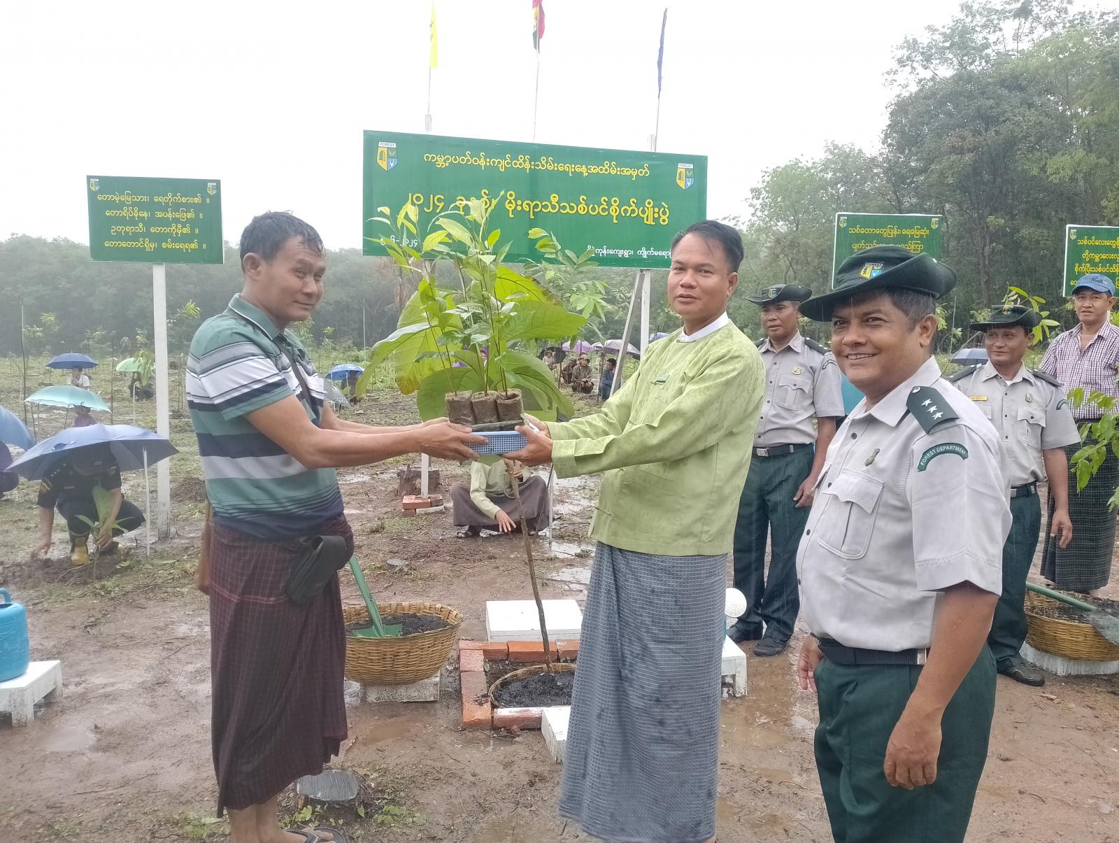 ဦးစွာ စိုက်ပျိုးမည့် ပျိုးပင်များကို မြို့နယ်စီမံအုပ်ချုပ်ရေးအဖွဲ့ဥက္ကဋ္ဌ ဦးကျော်စိုးဦးနှင့် သစ်တောဦးစီးဌာန ဦးစီးအရာရှိ ဦးဇော်မိုးဦးတို့က တက်ရောက်လာသူများထံ အပင်များပေးအပ်၍ စုပေါင်း သစ်ပင်စိုက်ပျိုးပွဲတော်ကို ကျင်းပခဲ့ကြသည်။