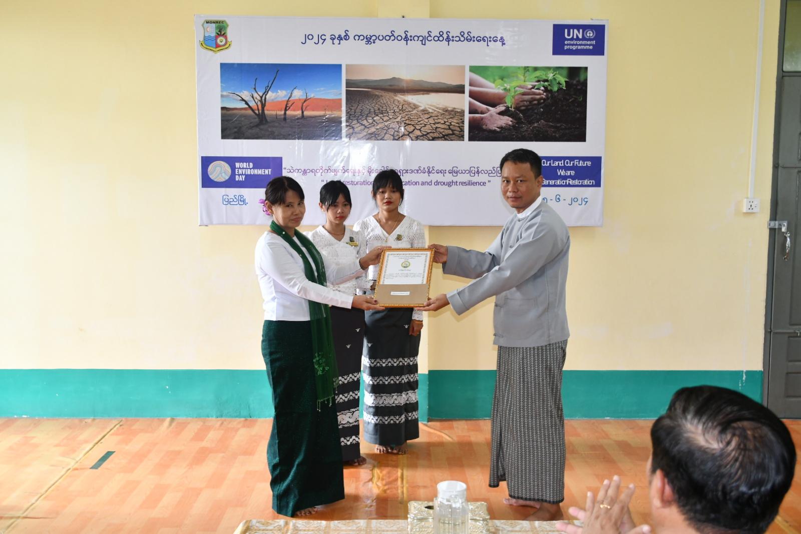 ဆက်လက်၍ ကမ္ဘာ့ပတ်ဝန်းကျင်ထိန်းသိမ်းရေးနေ့အထိမ်းအမှတ်ဗီဒီယိုအား ပြသပေးပြီး ပြည်ခရိုင်မှ ၂၀၂၃- ၂၀၂၄ ဘဏ္ဍာနှစ်အတွင်း အခြေခံပညာအထက်တန်း၊ အလယ်တန်းနှင့် မူလတန်းအဆင့် "သန့်ရှင်း၍ စိမ်းလန်းစိုပြေသော ကျောင်းဆု" ပြိုင်ပွဲတွင် ပထမဆုဆွတ်ခူးရရှိခဲ့သော အ-ထ-က (၅) ပြည်၊ အ-လ-က (အုတ်ပုံ) နှင့် အ-မ-က (တည်သီးပြင်) ကျောင်းတို့အား ခရိုင်စီမံအုပ်ချုပ်ရးအဖွဲ့ဥက္ကဋ္ဌနှင့် ခရိုင်ပတ်ဝန်းကျင်ထိန်းသိမ်းရေးဦးစီးဌာနမှူးတို့က ဂုဏ်ပြုမှတ်တမ်းလွှာနှင့် ဆုများ ချီးမြှင့်ပေးအပ်သည်။