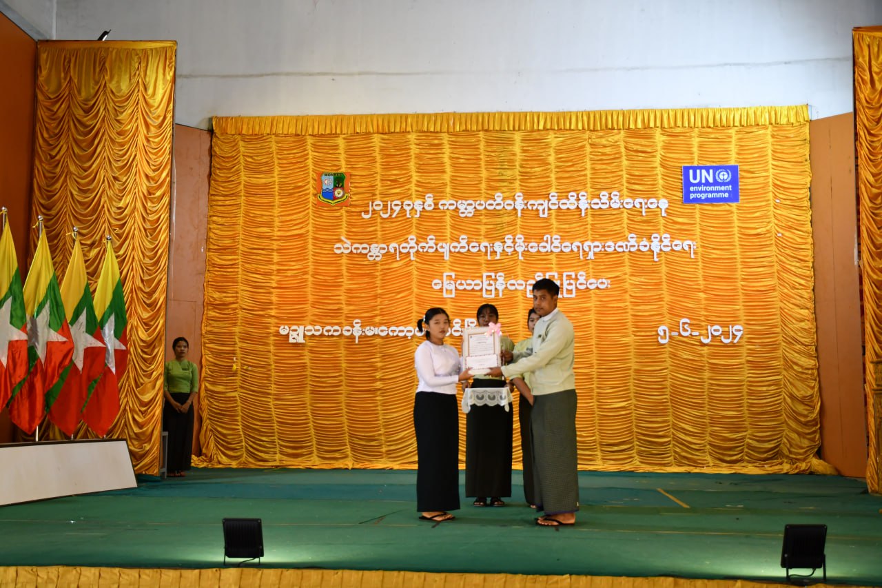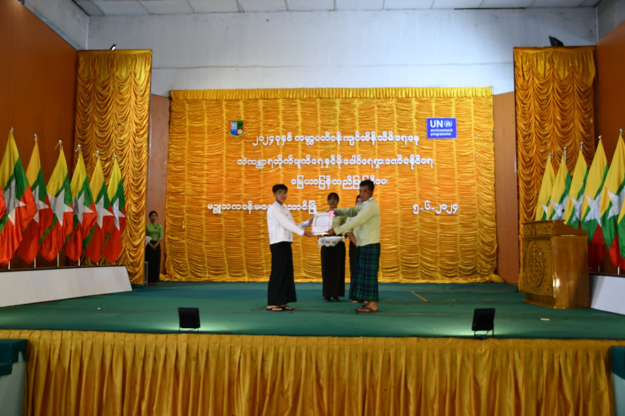 ယင်းနောက် အခမ်းအနားတွင် ကုလသမဂ္ဂအထွေထွေအတွင်းရေးမှူးချုပ်၏ သဝဏ်လွှာဗီဒီယို၊ ကုလသမဂ္ဂပတ်ဝန်းကျင်အစီအစဉ် (UNEP) ၏ ဗီဒီယို၊ ၂၀၂၄ ခုနှစ် ကမ္ဘာ့ပတ်ဝန်းကျင်ထိန်းသိမ်းရေးနေ့အထိမ်းအမှတ် အသိပညာပေးဗီဒီယိုများပြသခဲ့ပြီး ၂၀၂၄ ခုနှစ် ကမ္ဘာ့ပတ်ဝန်းကျင်ထိန်းသိမ်းရေးနေ့ အထိမ်းအမှတ်ဆောင်ပုဒ်ဖြစ်သော “သဲကန္တာရတိုက်ဖျက်ရေးနှင့် မိုးခေါင်ရေရှားဒဏ်ခံနိုင်ရေး မြေယာပြန်လည်ပြုပြင်ပေး” ဖြင့် အခြေခံပညာအထက်တန်းအဆင့်နှင့် အလယ်တန်းအဆင့် စာစီစာကုံးပြိုင်ပွဲတွင် ပထမ၊ ဒုတိယနှင့်တတိယဆုရရှိသော ကျောင်းသား/သူများအား ခရိုင်စီမံအုပ်ချုပ်ရေးအဖွဲ့ဥက္ကဋ္ဌ၊ ခရိုင်ရဲတပ်ဖွဲ့မှူးနှင့် မြို့နယ်စီမံအုပ်ချုပ်ရေးအဖွဲ့ဥက္ကဋ္ဌတို့မှ ဆုများအသီးသီးချီးမြှင့်ပေးအပ်ခဲ့ပါသည်။