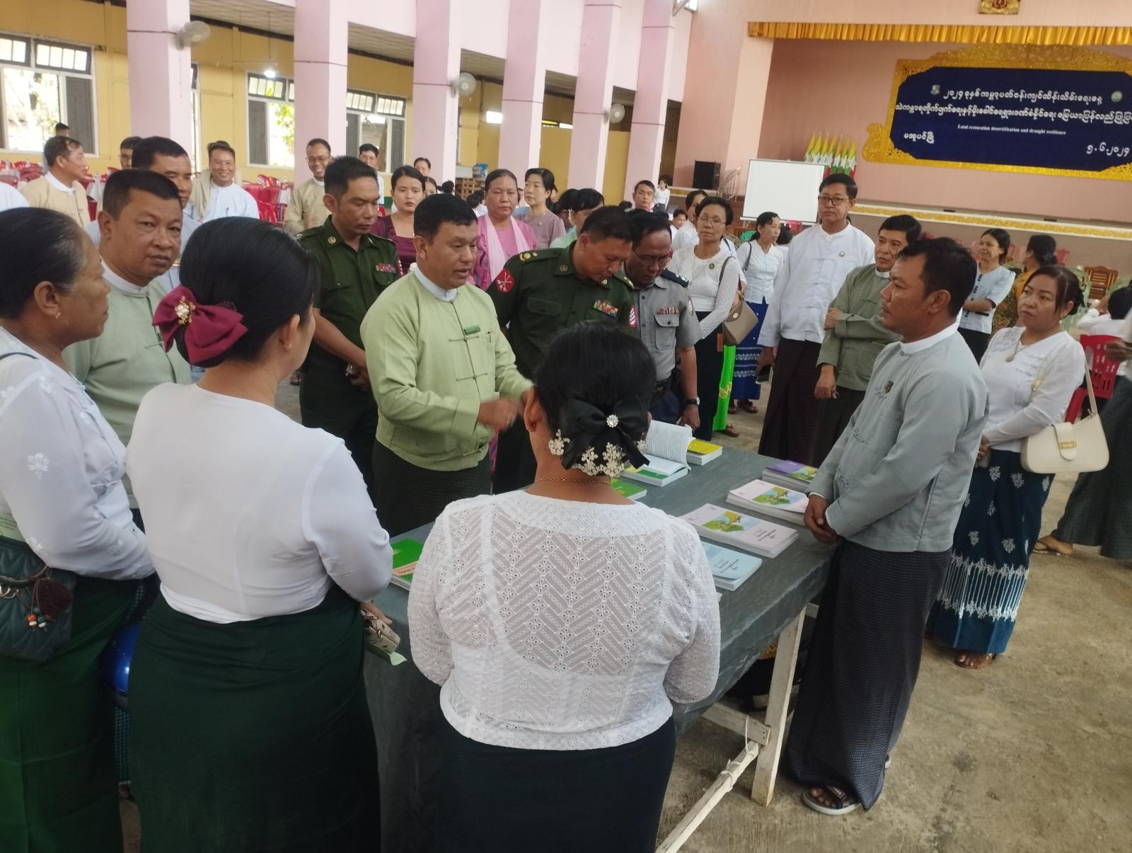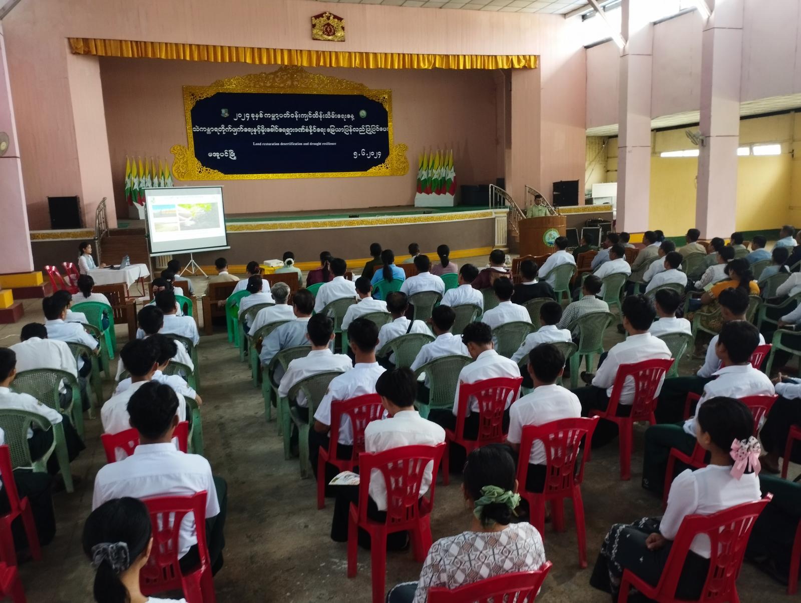 အခမ်းအနားတွင် ခရိုင်စီမံအုပ်ချုပ်ရေးအဖွဲ့ဥက္ကဋ္ဌ ဦးမြင့်နိုင်မှ အဖွင့်အမှာစကားပြောကြားရာတွင် “သဲကန္တာရတိုက်ဖျက်ရေးနှင့် မိုးခေါင်ရေရှားဒဏ်ခံနိုင်ရေး မြေယာပြန်လည်ပြုပြင်ပေး” ဆောင်ပုဒ်နှင့်အညီ သစ်ပင်များစိုက်ပျိုးခြင်း၊ ကျေးရွာထင်းစိုက်ခင်းများထူထောင်ခြင်း၊ အိမ်ခြံဝင်း အတွင်း သစ်ပင်ပန်းမျိုးစုံ စိုက်ပျိုးခြင်းနှင့် မြေယာပြန်လည်ထိန်းသိမ်းခြင်းလုပ်ငန်းများအား ရှင်းလင်းပြောကြားပြီး၊ ပတ်ဝန်ကျင်ထိန်းသိမ်းရေးဦးစီးဌာန လက်ထောက်ညွှန်ကြားရေးမှူး ဦးအောင်ကျော်ထွန်းမှ ကုလသမဂ္ဂအထွေထွေအတွင်းရေးမှူးချုပ်၏ ၂၀၂၄ ခုနှစ်၊ ကမ္ဘာ့ပတ်ဝန်းကျင်ထိန်းသိမ်းရေးနေ့အတွက် ပေးပို့သော သဝဏ်လွှာ ကောက်နုတ်ချက်များအား ဖတ်ကြားသည်။ ဆက်လက်၍ ၂၀၂၄ ခုနှစ်၊ ကမ္ဘာ့ပတ်ဝန်းကျင်ထိန်းသိမ်းရေးနေ့ အထိမ်းအမှတ် အသိပညာပေး Video Clip အားပြသခဲ့သည်။ ၎င်းနောက် လက်ထောက်ညွှန်ကြားရေးမှူးမှ ပြသထားသည့် အသိပညာပေး နံရံကပ်စာစောင်များနှင့် စာအုပ်များအား ရှင်းလင်းပြသရာ တက်ရောက်လာသူ များမှ စိတ်ပါဝင်စားစွာ လေ့လာကြည့်ရှုခဲ့ကြသည်။