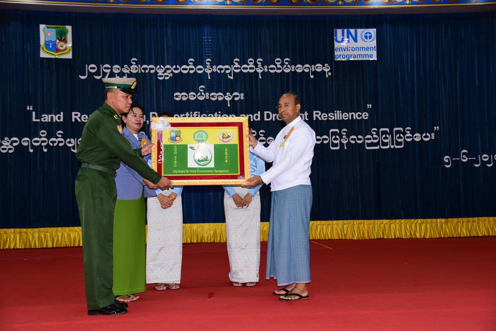ဆက်လက်၍ ကမ္ဘ့ာပတ်ဝန်းကျင်ထိန်းသိမ်းရေးနေ့အထိမ်းအမှတ် Video Clip ပြသပြီး ပတ်ဝန်းကျင်စီမံခန့်ခွဲမှု ကောင်းမွန်သော မြို့ဆုနှင့် အခြေခံပညာအထက်တန်းအဆင့် စာစီစာကုံးပြိုင်ပွဲတွင် ပထမဆုရရှိသူအား ရှမ်းပြည်နယ်ဝန်ကြီးချုပ်ဦးအောင်အောင်က ဂုဏ်ပြုဆုငွေ၊ ကျောက်စီပန်းချီကားနှင့် ဂုဏ်ပြုမှတ်တမ်းလွှာများ ပေးအပ်၍လည်းကောင်း၊ အခြေခံပညာအထက်တန်းအဆင့် စာစီစာကုံးပြိုင်ပွဲတွင် ဒုတိယ၊ တတိယနှင့် နှစ်သိမ့်ဆုရရှိသူအား ပြည်နယ်တရားလွှတ်တော် တရားသူကြီးချုပ်က ဂုဏ်ပြုဆုငွေနှင့် ဂုဏ်ပြုမှတ်တမ်းလွှာများ ချီးမြှင့်ပေး၍လည်းကောင်း၊ သန့်ရှင်း၍စိမ်းလန်းစိုပြည်သော ကျောင်းဆုရရှိသည့် အခြေခံပညာအထက်တန်းအဆင့်ကျောင်းများ၊ မူလတန်းအဆင့်ကျောင်းများ၊ ရှမ်းပြည်နယ်အတွင်း သန့်ရှင်း၍ စိမ်းလန်းစိုပြည်သော ကျောင်းဖော်ဆောင်ရန် ပါဝင်ကူညီလှူဒါန်းပေးသော အလှူရှင်များတို့ကို ပြည်နယ်ဝန်ကြီးများ၊ ပြည်နယ်ဥပဒေချုပ်တို့က ဂုဏ်ပြုဆုငွေ ကျောက်စီပန်းချီကားနှင့် ဂုဏ်ပြုမှတ်တမ်းလွှာများအသီးသီး ချီးမြှင့်ပေးကြသည်။
