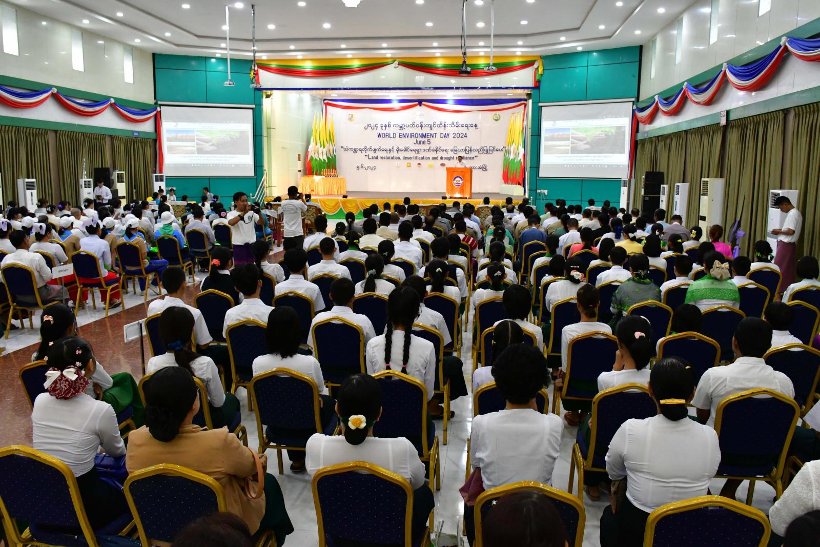 ဆက်လက်၍ သဲကန္တာရတိုက်ဖျက်ရေးနှင့် မိုးခေါင်ရေရှားဒဏ်ခံနိုင်ရေး မြေယာပြန်လည်ပြုပြင်ပေး ဆောင်ပုဒ်ဖြင့် ၂၀၂၄ ခုနှစ် ကမ္ဘာ့ပတ်ဝန်းကျင်ထိန်းသိမ်းရေးနေ့အခမ်းအနားကို ဇွန်လ ၅ ရက်နေ့ နံနက် ၉ နာရီက ဘားအံမြို့၊ ဇွဲကပင်ခန်းမ၌ ကျင်းပရာ ပြည်နယ်ဝန်ကြီးချုပ်က ယနေ့ကမ္ဘာကြီးတွင် အဓိကရင်ဆိုင်ကြုံတွေ့နေရသည့် စိုးရိမ်ဖွယ်အကျပ် အတည်း(၃)မျိုးဖြစ်သော ရာသီဥတုပြောင်းလဲမှု၊ ဇီဝမျိုးစုံမျိုးကွဲများမျိုးသုဉ်းပျောက်ကွယ်မှုနှင့် စွန့်ပစ်ပစ္စည်းဆိုင်ရာ ပတ်ဝန်းကျင်ညစ်ညမ်းမှုများကို ပြန်လည်ကုစားပေးနိုင်မည့် ထူးခြားသောတစ်ခုတည်းသော နည်းလမ်းမှာ မြေယာထိန်းသိမ်းမှုလုပ်ငန်းများ မြှင့်တင်ဆောင်ရွက်ခြင်းပင်ဖြစ်ကြောင်း၊ အပြန်အလှန်အကျိုးပြု ဆက်နွယ်နေသည့် မြေယာပြန်လည်ပြုပြင်ရေးလုပ်ငန်းများနှင့် ဂေဟစနစ်ပြန်လည်ထိန်းသိမ်းရေးကို ကမ္ဘာ့အရွေ့နှင့် အတူ လိုက်ပါဆောင်ရွက်ကြရန် တိုက်တွန်းပြောကြားသည်။