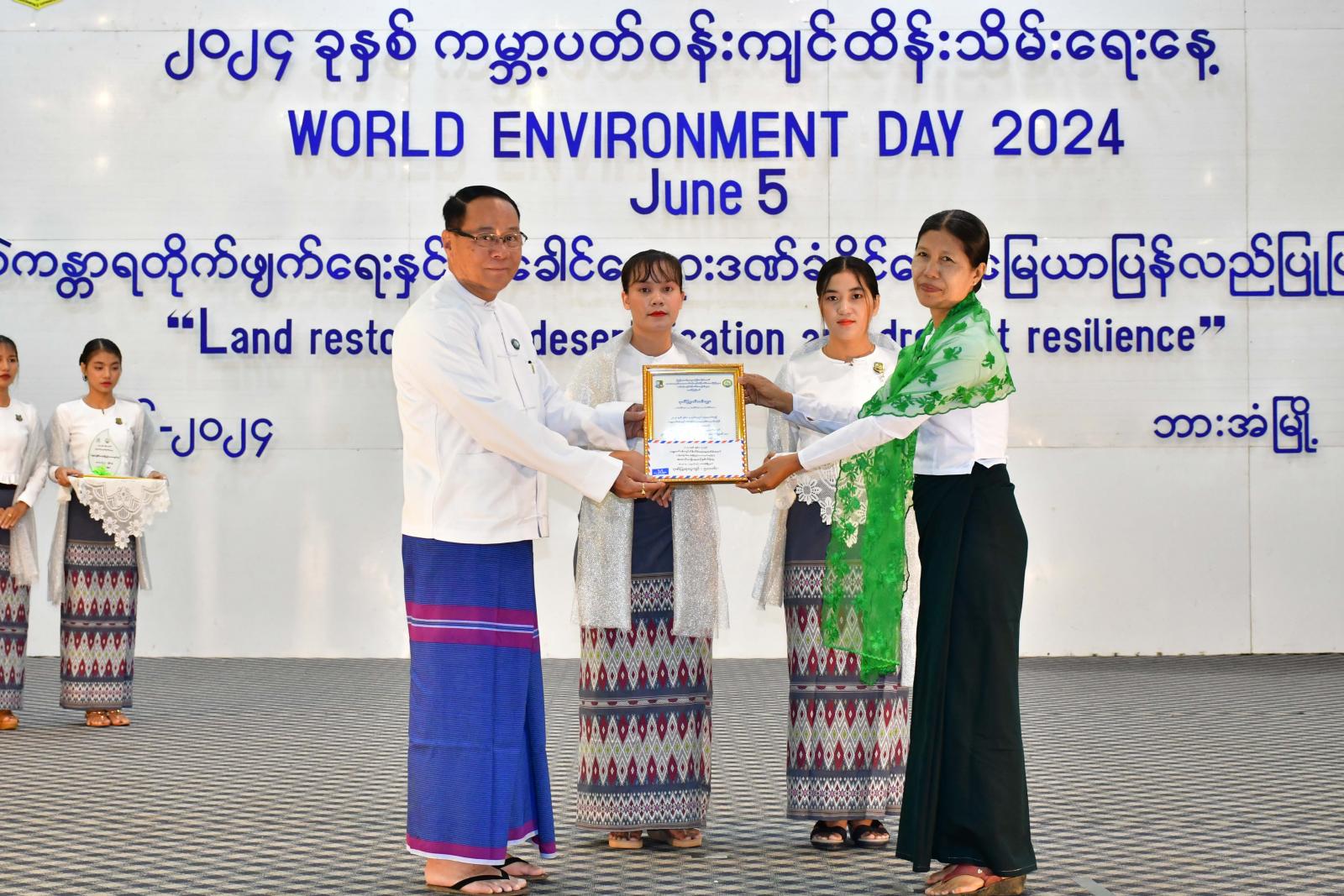 ထို့နောက် အခမ်းအနားသို့ တက်ရောက်လာသူများက ကုလသမဂ္ဂအထွေထွေအတွင်းရေးမှူးချုပ်၏ သဝဏ်လွှာ၊ ကုလသမဂ္ဂပတ်ဝန်းကျင်အစီအစဉ် (UNEP)နှင့် ၂၀၂၄ ခုနှစ်၊ ကမ္ဘာ့ပတ်ဝန်းကျင်ထိန်းသိမ်းရေးနေ့အထိမ်းအမှတ် Video Clip များကို ကြည့်ရှုခဲ့ကြပြီး ပြည်နယ်ဝန်ကြီးချုပ်၊ ပြည်နယ်တရားလွှတ်တော်တရားသူကြီးချုပ်၊ ပြည်နယ်အစိုးရအဖွဲ့ဝင်များ၊ ပြည်နယ်အမျိုးသမီးရေးရာအဖွဲ့ နာယကနှင့်အဖွဲ့ဝင်များက သန့်ရှင်း၍စိမ်းလန်းစို ပြေသောကျောင်းဆုရကျောင်းများ၊ ပတ်ဝန်းကျင်စီမံခန့်ခွဲမှုကောင်းမွန်သောကျေးရွာဆုများ၊ ပတ်ဝန်းကျင်စီမံခန့်ခွဲမှု ကောင်းမွန်သောလုပ်ငန်း(ဟိုတယ်လုပ်ငန်း)ဆုများ၊ ကမ္ဘာ့ပတ်ဝန်းကျင်ထိန်းသိမ်းရေးနေ့အထိမ်းအမှတ် အလွတ်တန်းဆောင်းပါပြိုင်ပွဲ၊ အဆင့်မြင့်ပညာစာစီစာကုံးပြိုင်ပွဲ၊ အခြေခံပညာအထက်တန်း၊ အလယ်တန်း၊ မူလတန်းအဆင့် စာစီစာကုံးပြိုင်ပွဲ၊ ဉာဏ်စမ်းပဟေဠိပြိုင်ပွဲတို့တွင် ဆုရရှိကြသူများအား ဂုဏ်ပြုဆုများပေးအပ်ချီးမြှင့်ကြကာ အခမ်းအနားဖြစ်မြောက်ရေး ဝိုင်းဝန်းကူညီပေးသူများအား ဂုဏ်ပြုမှတ်တမ်းလွှာများ ပေးအပ်ခဲ့ကြသည်။