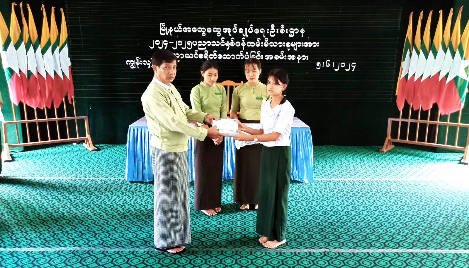 ထို့နောက် မြို့နယ်အုပ်ချုပ်ရေးမှူးနှင့် တာဝန်ရှိသူများက မူလတန်း (၂၀) ဦး၊ အလယ်တန်း (၇) ဦး၊ အထက်တန်း (၈) ဦး၊ အဆင့်မြှင့်တန်း (၅) ဦး၊ စုစုပေါင်း ကျောင်းသား၊ ကျောင်းသူ (၄၀) ဦးတို့အား ထောက်ပံ့ငွေနှင့် ကျောင်းသုံးဗလာစာအုပ်များ ပေးအပ်ခဲ့ကြောင်း သိရသည်။