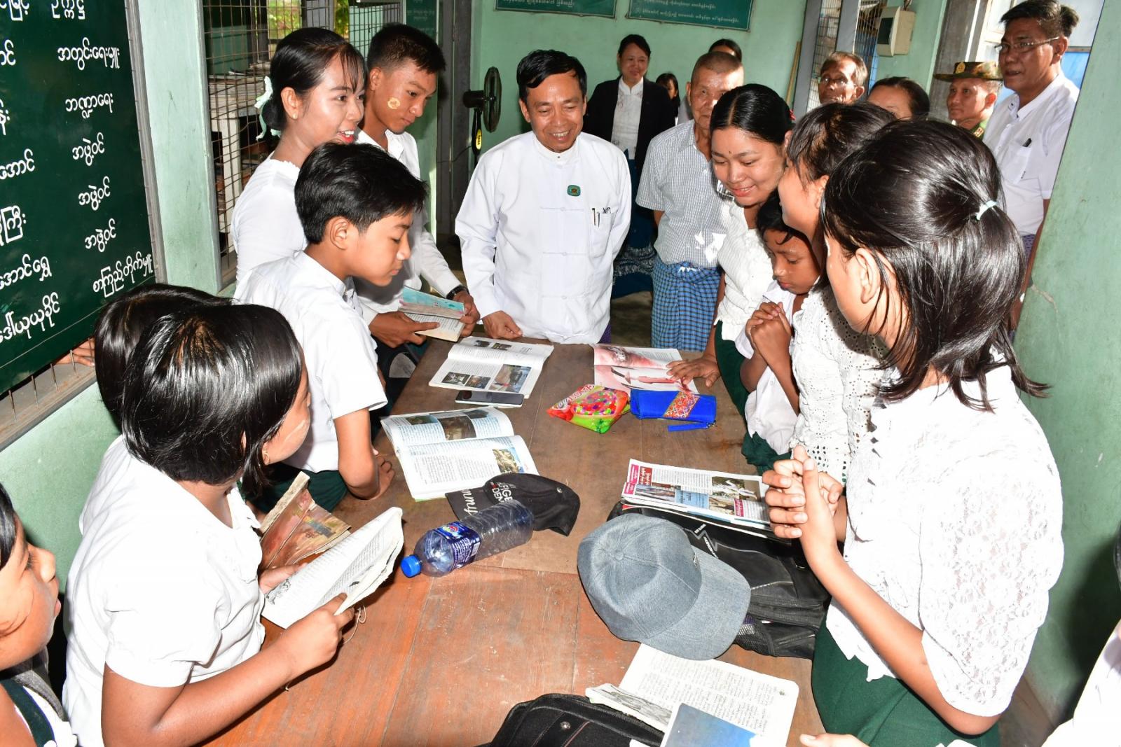 ထိုမှတစ်ဆင့် နေပြည်တော်ကောင်စီဥက္ကဋ္ဌနှင့်အဖွဲ့သည် ဝက္ကမူကျေးရွာ ရွှေမူရောင်ခြည်ဦး စာကြည့်တိုက်သို့ သွားရောက်ကြည့်ရှုအားပေးပြီး လိုအပ်သည်များကို တာဝန်ရှိသူများအား မှာကြားသည်။