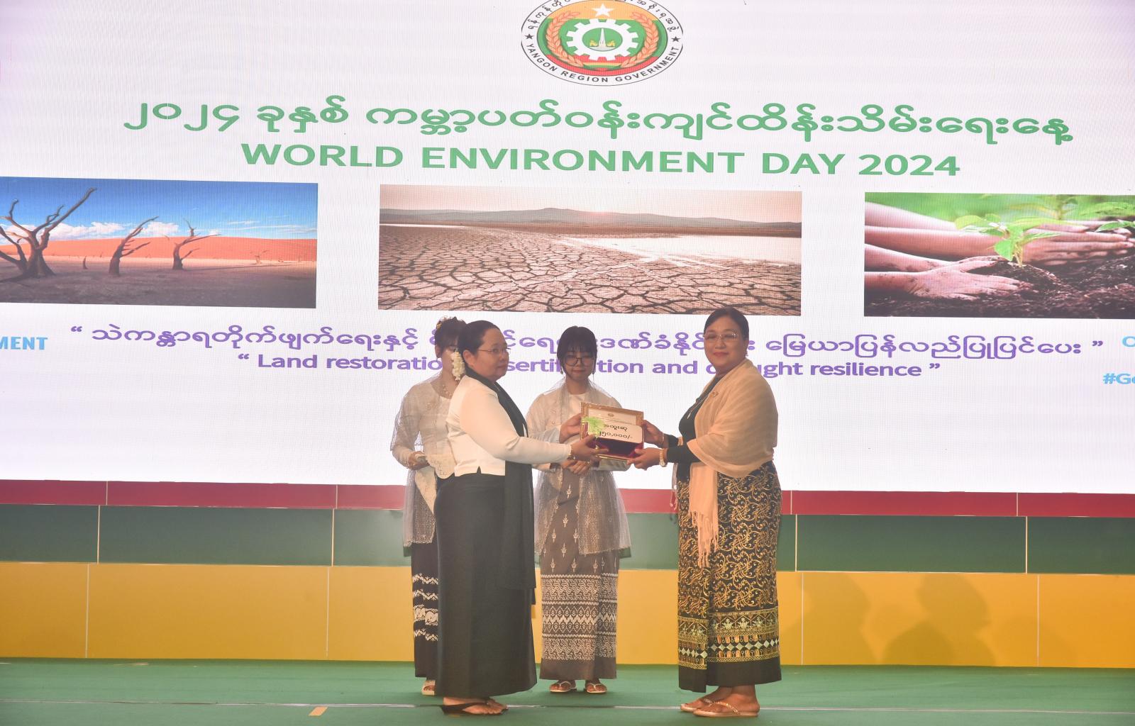 ရန်ကုန်တိုင်းဒေသကြီး၌ ၂၀၂၄ ခုနှစ်၊ ကမ္ဘာ့ပတ်ဝန်းကျင်ထိန်းသိမ်းရေးနေ့ အထိမ်းအမှတ် အခမ်းအနားကို (သဲကန္တာရတိုက်ဖျက်ရေးနှင့် မိုးခေါင်ရေရှားဒဏ်ခံနိုင်ရေး မြေယာပြန်လည် ပြုပြင်ပေး)" ဆောင်ပုဒ်ဖြင့် ယမန်နေ့ နံနက် ၉ နာရီတွင် ရန်ကုန်တိုင်းဒေသကြီး အစိုးရအဖွဲ့ရုံး၊ မင်္ဂလာခန်းမ၌ ကျင်းပရာ ရန်ကုန်တိုင်းဒေသကြီးအစိုးရအဖွဲ့ ဝန်ကြီးချုပ် ဦးစိုးသိန်း တက်ရောက် အဖွင့်အမှာစကားပြောကြားသည်။