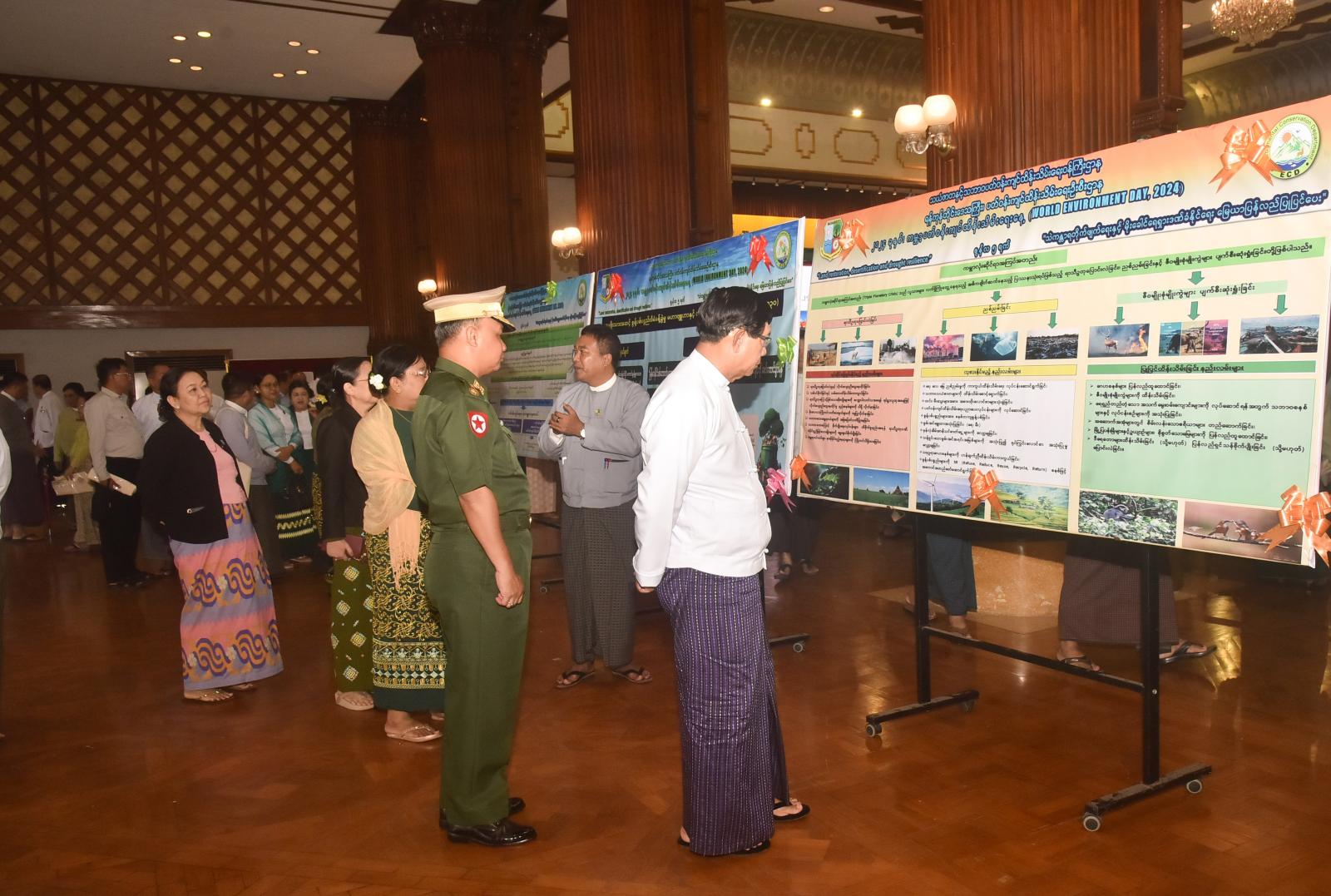 အခမ်းအနားတွင် ၂၀၂၄ ခုနှစ်၊ ကမ္ဘာ့ပတ်ဝန်းကျင်ထိန်းသိမ်းရေးနေ့ အထိမ်းအမှတ်အတွက် ကုလသမဂ္ဂအတွင်းရေးမှူးချုပ် Mr. Antonio Guteress နှင့် ကုလသမဂ္ဂ ပတ်ဝန်းကျင် အစီအစဉ်အမှုဆောင် ညွှန်ကြားရေးမှူး Ms.Inger Andersen တို့ကသဝဏ်လွှာကို ဖတ်ကြားသည့် ဗီဒီယို၊ ပတ်ဝန်းကျင်ထိန်းသိမ်းရေးဦးစီးဌာနမှ ရိုက်ကူးထားသည့် ၂၀၂၄ ခုနှစ်၊ ကမ္ဘာ့ ပတ်ဝန်းကျင်ထိန်းသိမ်းရေးနေ့အထိမ်းအမှတ် (သဲကန္တာရတိုက်ဖျက်ရေးနှင့် မိုးခေါင်ရေရှားဒဏ်ခံ နိုင်ရေး မြေယာပြန်လည်ပြုပြင်ပေး)” ဆောင်ပုဒ်အတွက် ပညာပေးဗီဒီယို၊ အခြေခံပညာ အထက်တန်း၊ အလယ်တန်းနှင့် မူလတန်းအဆင့် သန့်ရှင်း၍ စိမ်းလန်းစိုပြည်သော ကျောင်းဆု ရရှိသည့် ကျောင်းများ၏ ဆောင်ရွက်ထားရှိမှု မှတ်တမ်းဗီဒီယို၊ ပတ်ဝန်းကျင်စီမံခန့်ခွဲမှု အကောင်းဆုံးဆုရ စက်ရုံများ၏ ဆောင်ရွက်ထားရှိမှု မှတ်တမ်းဗီဒီယိုတို့ကို ပြသသည်။