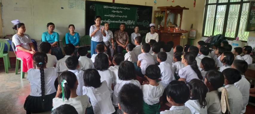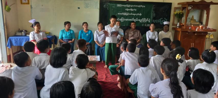 ဦးစွာ ကျောင်းအုပ်ဆရာမကြီး ဒေါ်မော်ရီက အမှာစကားပြောကြားပြီး၊ ပြန်ကြားရေးနှင့်ပြည်သူ့ဆက်ဆံရေးဦးစီးဌာန ဦးစီးအရာရှိ ဒေါ်အေးအေးသီက လူငယ်များ ဗဟုသုတကြွယ်ဝပြီး၊ မိမိ၏ဘဝဖွံ့ဖြိုးတိုးတက်ရေးအတွက် ဗဟုသုတရရှိစေမည့်စာများကို ကျောင်းစာကြည့်တိုက်များတွင် ဖတ်ရှုကြစေရေး၊ မူးယစ်ဆေးဝါးအန္တရာယ်ဆိုင်ရာ အကြောင်းအရာများ၊ ယနေ့ကျောင်းသား၊ ကျောင်းသူများ လူကုန်ကူးမှုမခံရစေရေး လူကုန်ကူးမှုဖြစ်စဥ် အကြောင်းအရာများကို အသိပညာပေးပြောကြားပြီး၊ ကျေးလက်ကျန်းမာရေး ဆရာမဒေါ်အေးမော်က ကျောင်းကျန်းမာရေးဆိုင်ရာ အကြောင်းအရာများ ပြောကြားသည်။