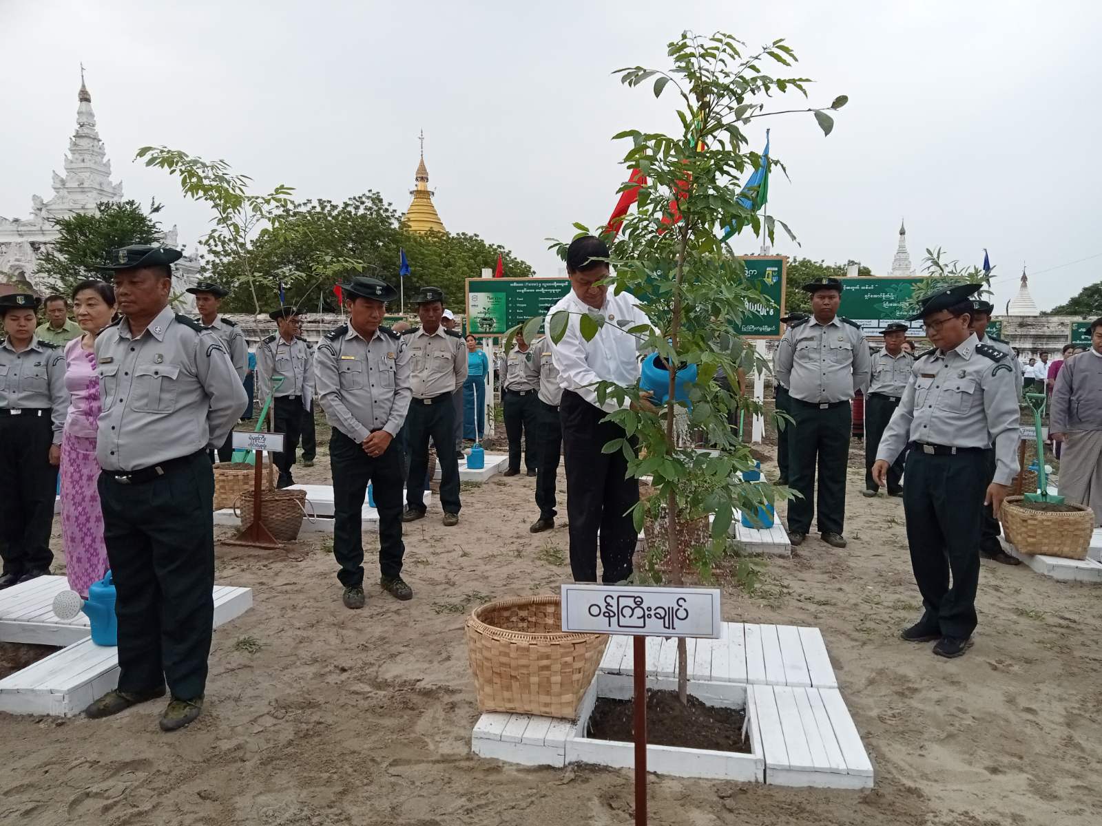 မိုးရာသီစုပေါင်းသစ်ပင်စိုက်ပျိုးပွဲသို့ တိုင်းဒေသကြီးအစိုးရအဖွဲ့ဝန်ကြီးချုပ် ဦးမျိုးအောင်နှင့်အစိုးရအဖွဲ့ဝင်များ၊ တိုင်းဒေသကြီးအဆင့်ဌာနဆိုင်ရာများ၊ ခရိုင်စီမံအုပ်ချုပ်ရေးအဖွဲ့ဥက္ကဋ္ဌ ဦးတင်ဝင်းရွှေနှင့်အဖွဲ့ဝင်များ၊ ခရိုင်အဆင့်ဌာနဆိုင်ရာများ၊ မြို့နယ်စီမံအုပ်ချုပ်ရေးအဖွဲ့ဥက္ကဋ္ဌ ဦးသန်းနိုင်နှင့်အဖွဲ့ဝင်များ၊ မြို့နယ်အဆင့်ဌာနဆိုင်ရာများ၊ မြို့နယ်သစ်တောဦးစီးဌာနမှ ဝန်ထမ်းများ၊ မြို့နယ်အမျိုးသမီးရေးရာအဖွဲ့ဝင်များနှင့် မိခင်နှင့်ကလေးစောင့်ရှောက်ရေး အသင်းဝင်များ၊ ဆရာ/ဆရာမများ၊ ကျောင်းသား/ကျောင်းသူများ၊ ဒေသခံပြည်သူများ တက်ရောက်ကြပြီး တိုင်းဒေသကြီးဝန်ကြီးချုပ်က မဟောဂနီပင်ကို စိုက်ပျိုးပေးသည်။