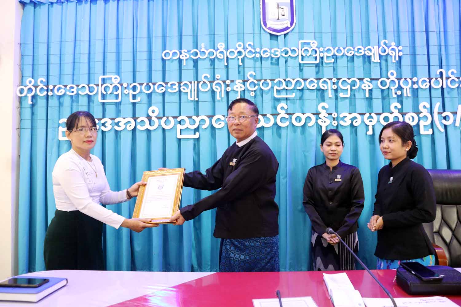 တနင်္သာရီတိုင်းဒေသကြီး ဥပဒေချုပ်ရုံးနှင့် တိုင်းဒေသကြီးပညာရေးဌာနတို့ ပူးပေါင်းဖွင့်လှစ်သော ဥပဒေအသိပညာပေး သင်တန်းအမှတ်စဉ် (၁/၂၀၂၄) သင်တန်းဆင်းပွဲအခမ်းအနားကို ယနေ့နံနက် ၁၀ နာရီက ထားဝယ်မြို့၊ တိုင်းဒေသကြီး ဥပဒေချုပ်ရုံး၊ အစည်းအဝေးခန်းမ၌ ကျင်းပသည်။