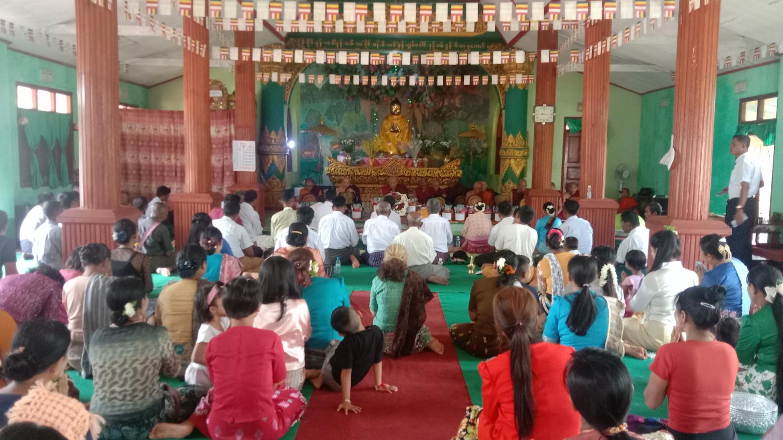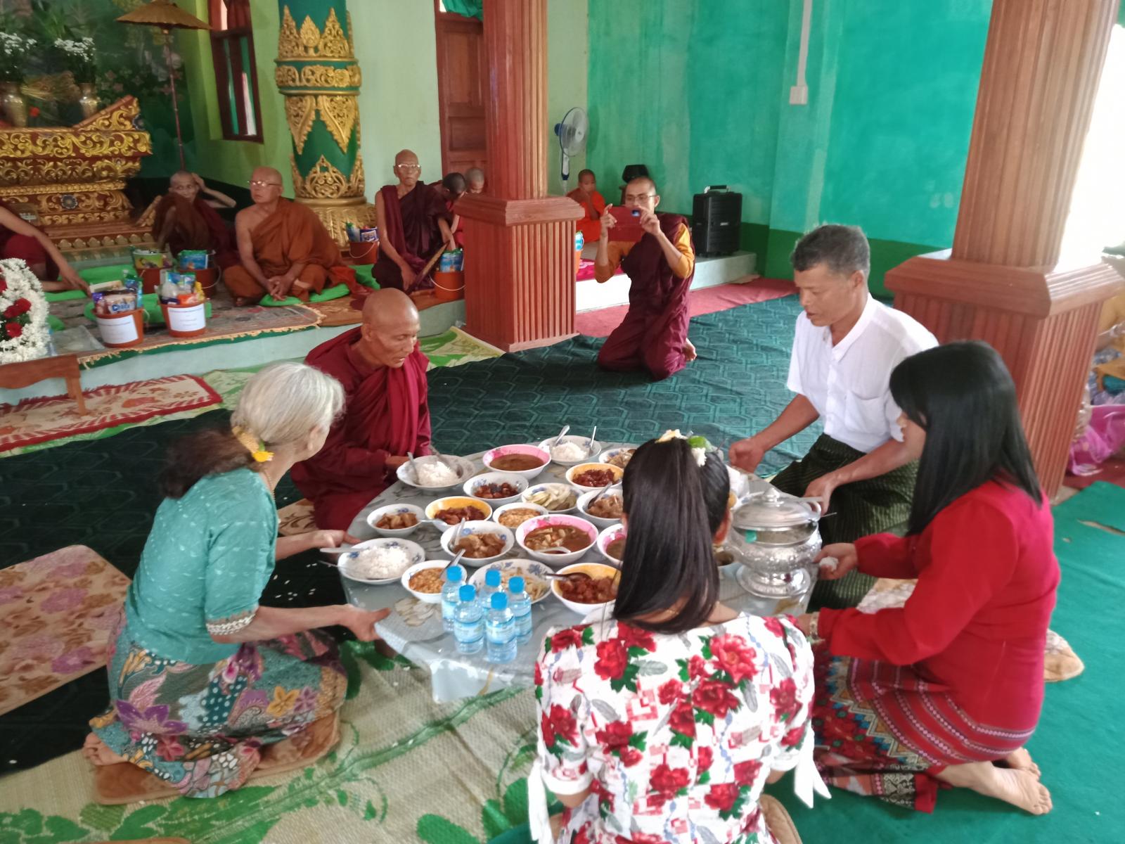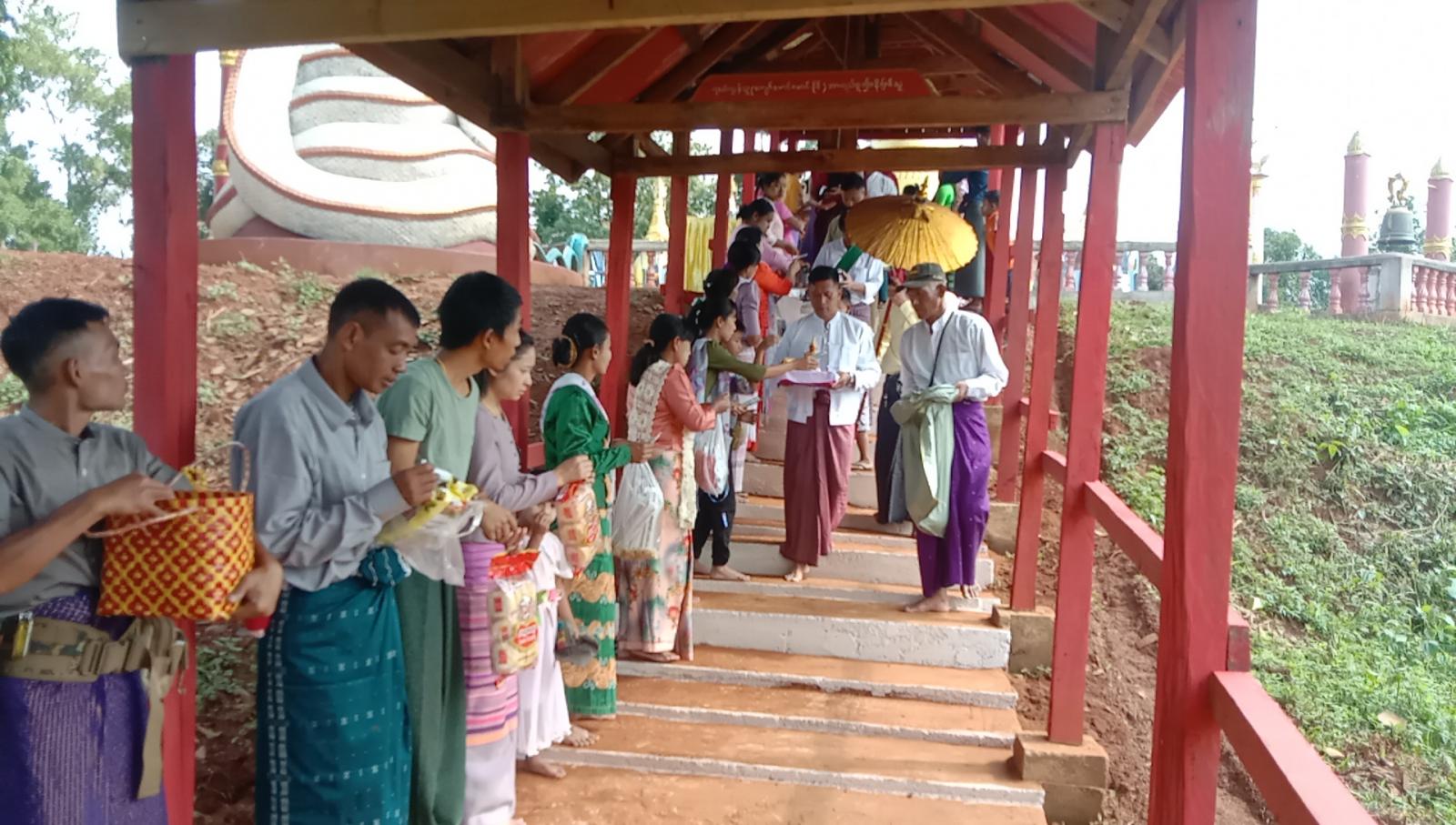 ရှေးဦးစွာ သံဃာတော်အရှင်သူမြတ်တို့က "လောကချမ်းသာလာဘမုနိ"စေတီတော်မြတ်၏ မုဒ်ဦးရွှေထီးတော်တင်လှူခြင်းအခမ်းအနား ကျင်းပခဲ့ကြပြီး မိုင်းခုတ်တပ်နယ်မှ တပ်နယ်မှူး ဒုတိယဗိုလ်မှူးကြီး သိန်းဇော်မိုးဦးဆောင်သော နယ်မြေခံတပ်ရင်းတပ်ဖွဲ့မိသားစုဝင်များ၊ မြို့အုပ်ချုပ်ရေးမှူး ဦးမျိုးသန့်ဦးဆောင်သော ဌာနဆိုင်ရာဝန်ထမ်းများ၊ ရပ်ကွက်အုပ်ချုပ်ရေးမှူးများ၊ မြို့မိမြို့ဖများနှင့် ဒေသခံပြည်သူများက စောင်းတန်းတစ်လျှောက် သံဃာတော်အရှင်သူမြတ်များအား ဆွမ်းဆန်တော်များ လောင်းလှူခဲ့ကြသည်။