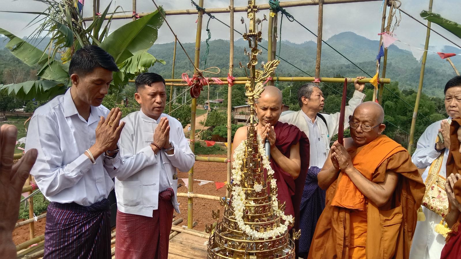 ထို့နောက် နမောတဿ (၃)ကြိမ်ရွက်ဆို၍ အခမ်းအနားဖွင့်လှစ်ကာ ၎င်းစေတီတော်မြတ်၏ မုဒ်ဦးရွှေထီးတော်၊ လှေခါး၊ စောင်းတန်း၊ ဆွမ်း စသည့်လှူဒါန်းထားမှုအစုစုတို့နှင့်အတူ ဒါတဗ္ဗဝတ္ထုအစုစုတို့ကို လှူဒါန်းပူဇော်ပြီး မိုင်းဆတ်မြို့နယ် သံဃနာယကအဖွဲ့ဝင် မြို့မတပ်ဦးကျောင်းဆရာတော်ထံမှ မအိပ်တဲ့ကုသိုလ် (၆)မျိုး တရားတော်နာကြား၍ ရေစက်သွန်းချကာအခမ်းအနားကို ရုတ်သိမ်းခဲ့ကြောင်း သိရသည်။