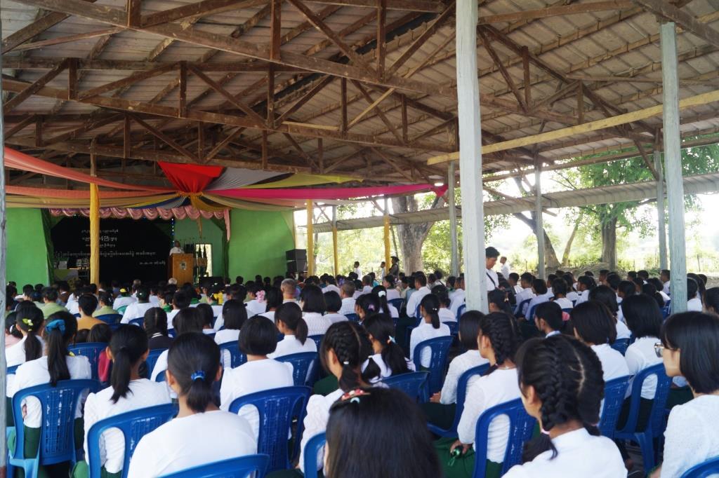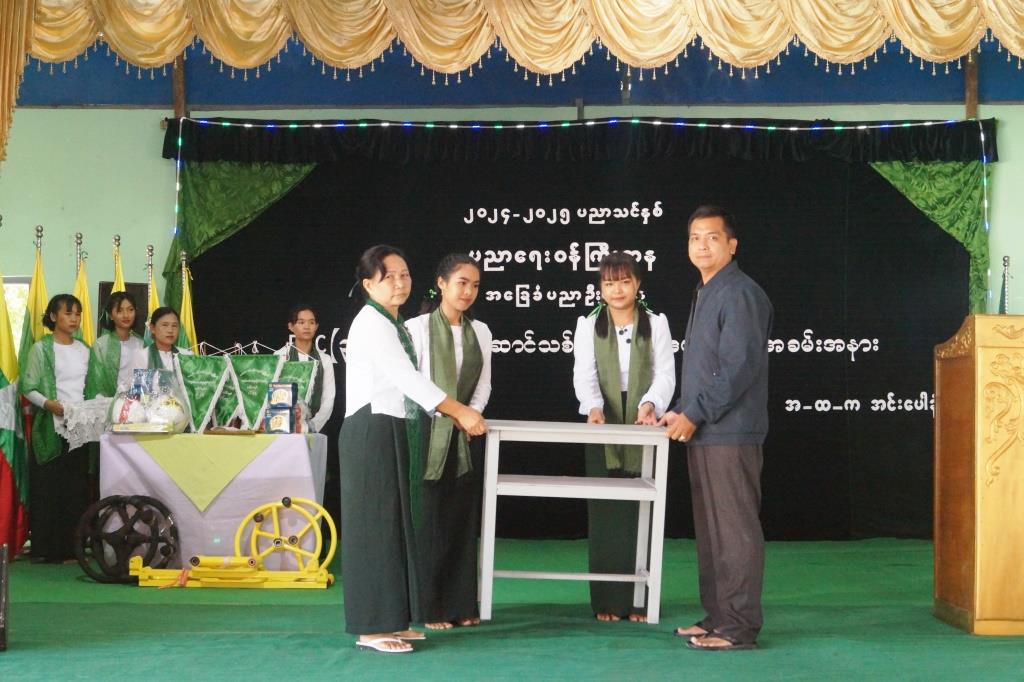 ယင်းနောက် လျှံထူးအောင်ကုမ္ပဏီတာဝန်ရှိသူက ကျောင်းသုံးစာသင်ခုံ အလုံး (၁၀၀)ကို ပေးအပ်လှူဒါန်းပြီး ကျောင်းဆောင်သစ်ဖွင့်ပွဲအထိမ်းအမှတ် အလံငယ်များကို နေရာအရောက်ပေးအပ်ခဲ့သည်။