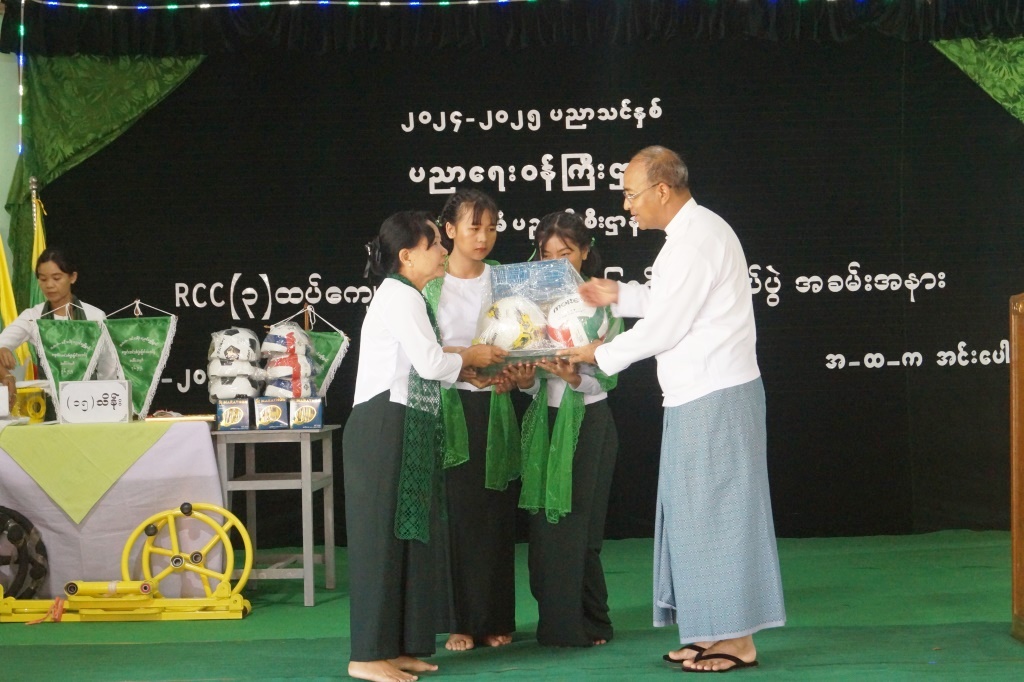 ၎င်းနောက် ပြည်နယ်ဝန်ကြီးချုပ်က အမှာစကားပြောကြားပြီး ကျောင်းအတွက် အားကစားပစ္စည်းများနှင့် အလှူငွေများ ပေးအပ်လှူဒါန်းရာ ကျောင်းအုပ်ဆရာမကြီး ဒေါ်ခင်ခင်ကြည်က လက်ခံရယူခဲ့သည်။