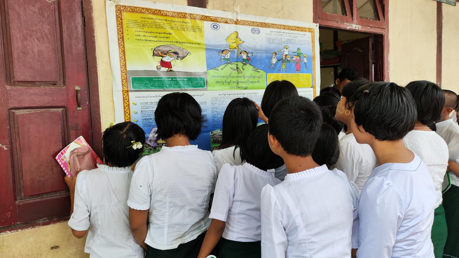 ထို့နောက် ကျောင်းသား၊ ကျောင်းသူများအား ရုပ်ပြပုံပြင်များပြောခြင်း၊ ကိုယ်ကာယလှုပ်ရှားမှု Activity လုပ်ငန်းစဥ်များ လိုက်ပါဆောင်ရွက်စေခြင်းများ ပြုလုပ်ခဲ့ပြီး ပြန်ကြားရေးနှင့်ပြည်သူ့ဆက်ဆံရေးဦးစီးဌာနမှ ခင်းကျင်းပြသထားသည့်၊ စာအုပ်စာစောင်များ၊ ကလေးအလုပ်သမားပပျောက်ရေး နံရံကပ်စာစောင်နှင့် မူးယစ်ဆေးဝါးအန္တရာယ် အသိပညာပေးနံရံကပ်စာစောင်များကို စိတ်ပါဝင်စားစွာ လေ့လာကြည့်ရှုခဲ့ကြောင်း သိရသည်။