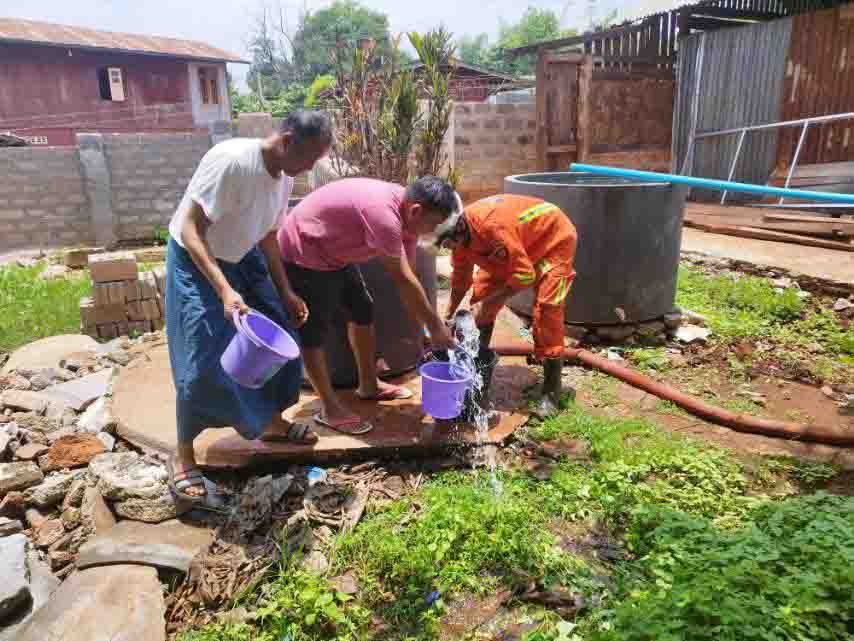 ထို့သို့သောက်သုံးရေဖြန့်ဝေရာတွင် မြို့နယ်မီးသတ်ဦးစီးဌာနမှ မြို့နယ်ဦးစီးမှူးနှင့် တပ်ဖွဲ့ဝင်များက သောက်သုံးရေလိုအပ်သည့် မြကန်သာရပ်ကွက်နှင့် ဟိုခဲရပ်ကွက်ရှိ ဒေသခံပြည်သူများအား ရေသယ် ယာဉ်ဖြင့် အိမ်တိုင်ရာရောက် အခမဲ့ဖြန့်ဝေပေးလျက်ရှိသည်။ ထို့ပြင် ဆီဆိုင်မြို့တွင် ပြန်လည်ဝင်ရောက်နေထိုင်ကြသည့် ဒေသခံပြည်သူများ သောက်သုံးရေပြတ်လတ်မှုမဖြစ်ပေါ်စေရေးအတွက် မြို့နယ်စည်ပင်သာယာရေးဌာနမှ မြို့ရေပေးဝေရေးလုပ်ငန်းများ ဆောင်ရွက်ပေးခြင်း၊ မြို့နယ်ကျေးလက်ဒေသဖွံ့ဖြိုးရေးဦးစီးဌာနမှ ဆိုလာအမြင့်တင်စနစ်အသုံးပြု၍ သောက်သုံးရေ ဖြန့်ဝေရေးနှင့် ရေသယ်ယာဉ်ဖြင့် သောက်သုံးရေဖြန့်ဝေရေးလုပ်ငန်းတို့ကို ဆောင်ရွက်ပေးလျက်ရှိပြီး ဒေသခံပြည်သူများအနေဖြင့် သောက်သုံးရေများလိုအပ်ပါက အဆိုပါဌာနများအား ဆက်သွယ်ဆောင်ရွက်နိုင်ကြောင်း သိရသည်။