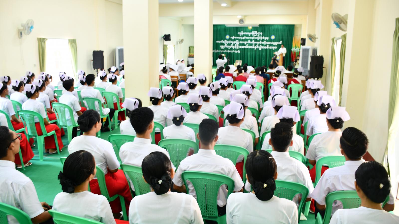 ထို့နောက် မုံရွာ-သူနာပြုနှင့် သားဖွားသင်တန်းကျောင်းမှ ကျောင်းအုပ်ဆရာမကြီးနှင့် တာဝန်ရှိ သူများက သူနာပြုသားဖွားဒီပလိုမာ(ပထမ)နှစ် သင်တန်းသား/သူများအား ဂျူတီကုတ် နှင့် ဦးဆောင်းများ အပ်နှင်းကြပြီး သင်တန်းသား/သူများက သူနာပြုသစ္စာအဓိဌာန်ရွတ်ဆိုကြသည်။
