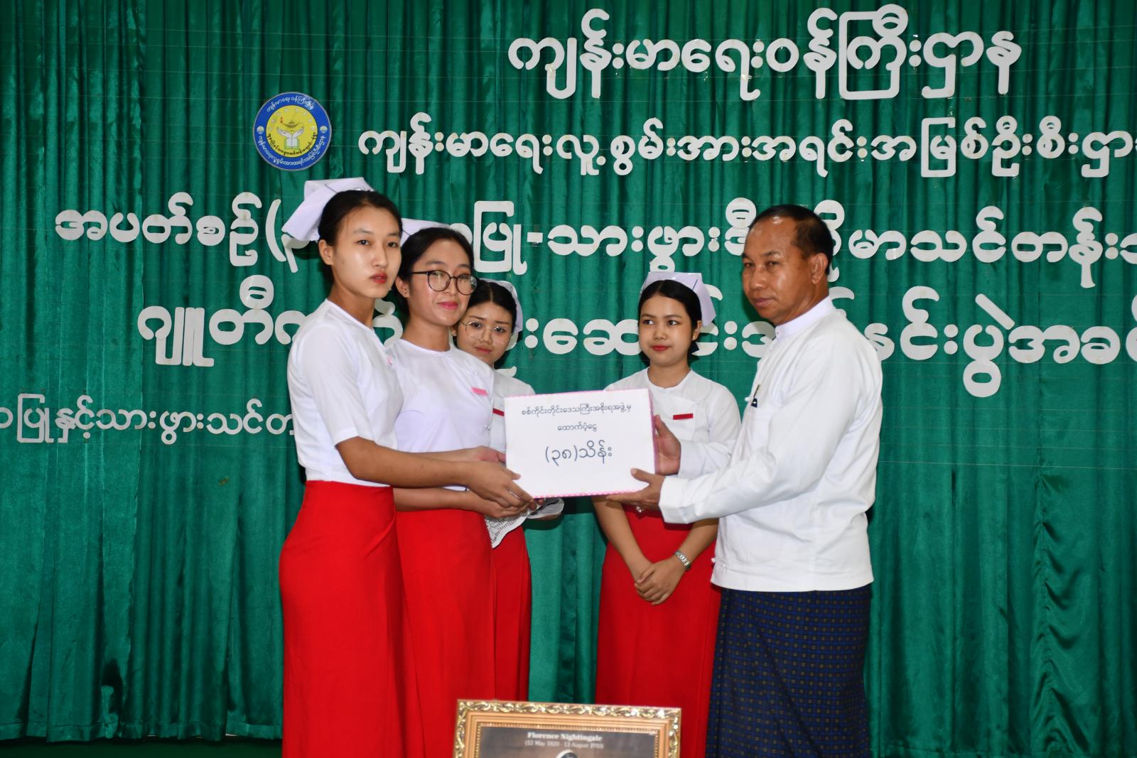 ယင်းနောက် တိုင်းဒေသကြီး ဝန်ကြီးချုပ်က အပတ်စဉ်(၃၀) သူနာပြုသားဖွား သင်တန်း သား/သူ (၇၆) ဦးအတွက် တစ်ဦးလျှင်ငွေကျပ်(၅၀၀၀၀) နှုန်းဖြင့် စုစုပေါင်း ငွေကျပ် - ၃၈၀၀၀၀၀ (သုံးဆယ်ရှစ်သိန်း)အား သင်တန်းသား/သူများကိုယ်စား သင်တန်းသား/သူ ၂ ဦးထံ ထောက်ပံ့ ပေးအပ်ပြီး ၂၀၂၃-ခုနှစ်၊ ပထမနှစ်(Senior) အတန်းတင်စာမေးပွဲတွင် ပထမ၊ ဒုတိယ၊ တတိယ ဆုရရှိကြသူများအား ဂုဏ်ပြုဆုငွေနှင့် ဂုဏ်ပြုဆုလက်မှတ်များအား ပေးအပ်ချီးမြှင့်သည်။