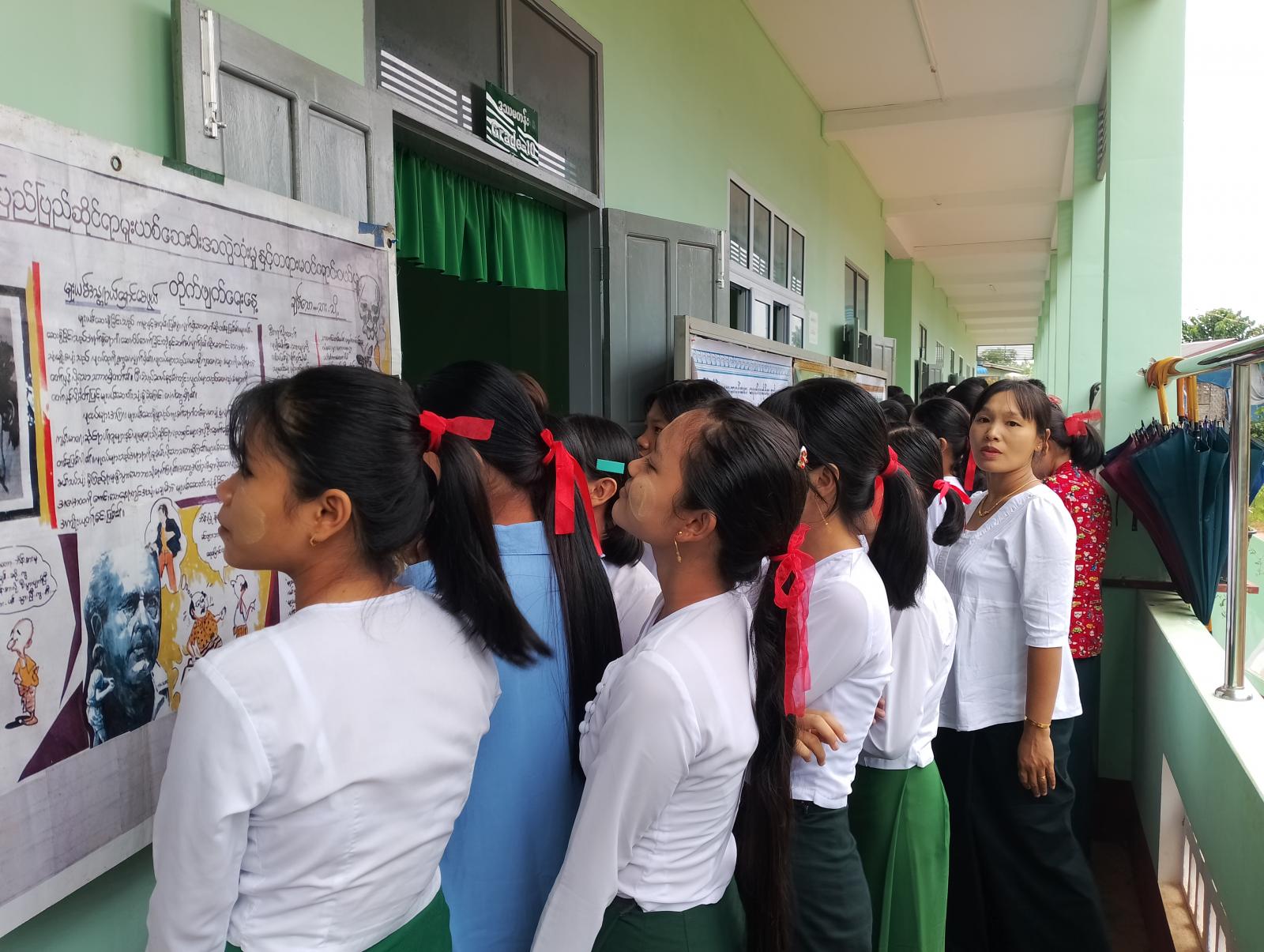 ထို့နောက် မူးယစ်ဆေးဝါးအန္တရာယ်နှင့်သက်ဆိုင်သော နံရံကပ်စာစောင်များ၊ ကလေးအလုပ်သမားပပျောက်ရေး ပညာပေးနံရံကပ်စာစောင်များနှင့်၊ ကလေးသူငယ်များ စစ်မှုထမ်းခြင်းမှ ကာကွယ်တားဆီးရေး အသိပညာပေးနံရံကပ်စာစောင်များကို ခင်းကျင်းပြသထားရာ အ.ထ.က ခွဲကျောင်းမှ ဆရာမများနှင့် ကျောင်းသား၊ ကျောင်းသူများက စိတ်ပါဝင်စားစွာ လေ့လာကြည့်ရှုခဲ့ကြသည်။