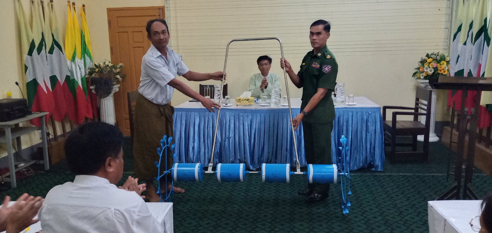 ဆက်လက်၍ မြို့နယ်စက်မှုလယ်ယာဦးစီးဌာန မြို့နယ်ဦးစီးမှူး ဦးထွန်းထွန်းဝင်းက မျိုးစေ့ချကိရိယာများအား ဖြန့်ဖြူးရခြင်းရည်ရွယ်ချက်ကို ပြောကြားပြီးကျေးရွာအုပ်စုများရှိ စပါးစိုက်တောင်သူများအား မြို့နယ်စီမံအုပ်ချုပ်ရေးအဖွဲ့ဥက္ကဋ္ဌ ဦးတင့်လွင်၊ အဖွဲ့ဝင် ဗိုလ်မှူးပြည်ထွန်းနှင့် တာဝန်ရှိသူများက စပါးမျိုးစေ့ချကိရိယာများကို လက်ဝယ်အရောက်ပေးအပ်ခဲ့ကြသည်။