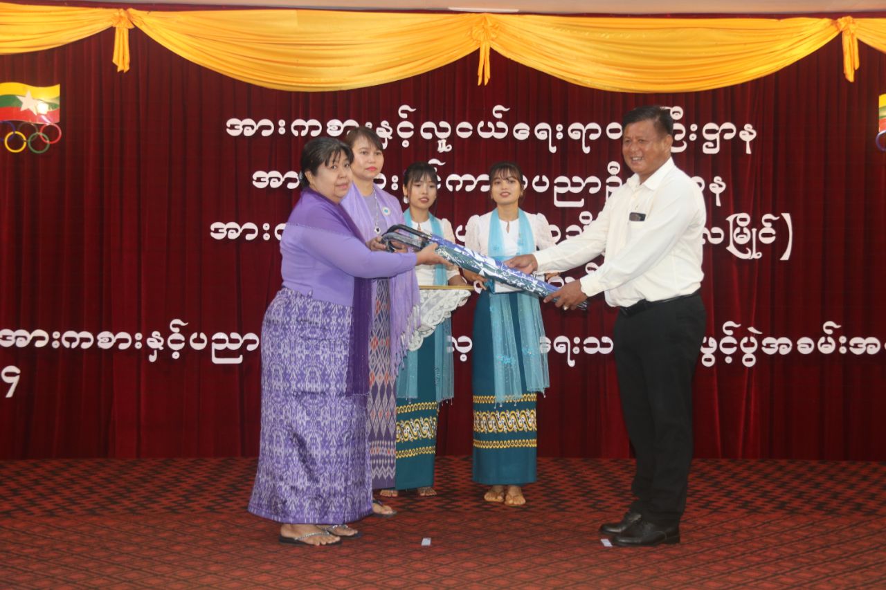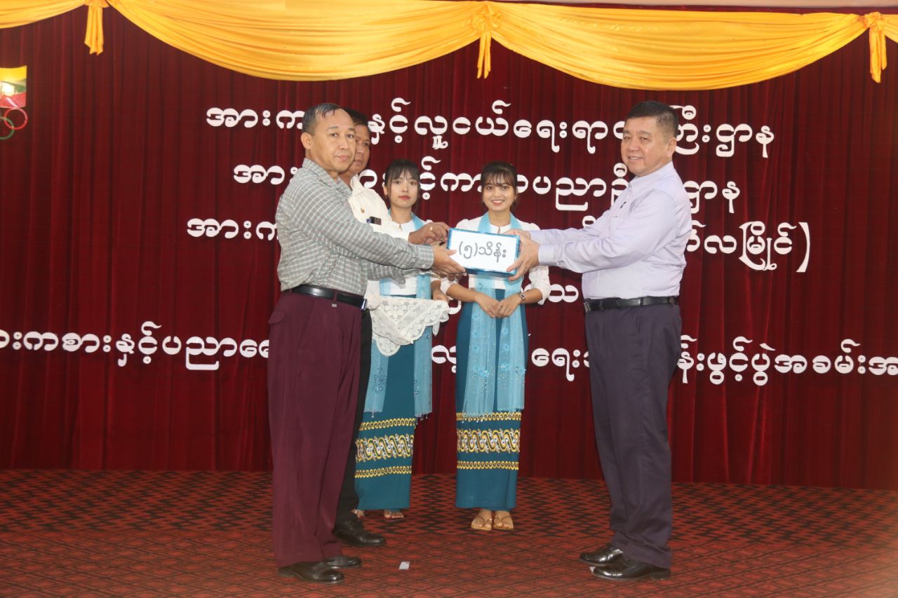 ဆက်လက်၍ မွန်ပြည်နယ် ဘောလုံးအဖွဲ့ချုပ်၊ မွန်ပြည်နယ်မိခင်နှင့်ကလေးစောင့်ရှောက်ရေးအသင်း၊ အမျိုးသမီးရေးရာအသင်းနှင့် အလှူရှင်များက အားကစားနှင့် ပညာရေးပေါင်းစပ် လေ့ကျင့်ရေးသင်တန်းအတွက် အလှူငွေနှင့် ထောက်ပံ့ပစ္စည်းများ ပေးအပ်လှူဒါန်းခဲ့ရာ အားကစားနှင့် ကာယပညာသိပ္ပံ (မော်လမြိုင်) ကျောင်းအုပ်ကြီး၊ ညွှန်ကြားရေးမှူး ဦးမောင်မောင်မြင့်က လက်ခံရယူပြီး ဂုဏ်ပြုမှတ်တမ်းလွှာများ ပြန်လည်ပေးအပ်ခဲ့သည်။
