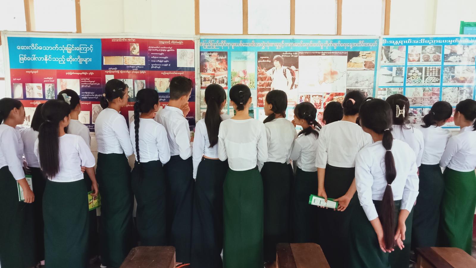 ထို့နောက် ကျောင်းသား/သူများအား ပြန်ကြားရေးနှင့်ပြည်သူ့ဆက်ဆံရေးဦးစီးဌာနမှ ပြသထားသော မူးယစ်ဆေးဝါးအန္တရာယ်နှင့်ပတ်သက်၍ အသိပညာပေး နံရံကပ်စာစောင်များကို ပြသထားရာ ကျောင်းသား /သူများက စိတ်ဝင်စားစွာ ကြည့်ရှုလေ့လာမှတ်သားခဲ့ကြောင်း သိရသည်။