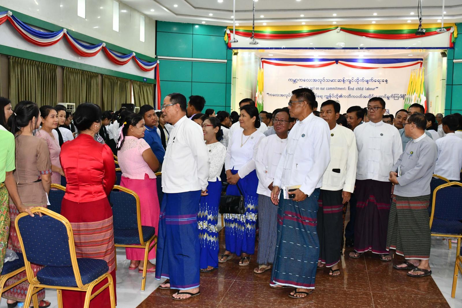 ဆက်လက်၍ “ ကလေးအလုပ်သမားအဆုံးသတ်ရေး ကျွန်ုပ်တို့၏ ကတိကဝတ်အတိုင်းဆောင်ရွက်ကြပါစို့ ” ဟူသောဆောင်ပုဒ်ဖြင့် ကမ္ဘာ့ကလေးအလုပ်သမားဆန့်ကျင်တိုက်ဖျက်ရေးနေ့ အထိမ်းအမှတ်အခမ်းအနားကို နံနက် ၁၀ နာရီက ဘားအံမြို့၊ ဇွဲကပင်ခန်းမ၌ကျင်းပရာ ကရင်ပြည်နယ် ကလေးအလုပ်သမားပပျောက်ရေးဆိုင်ရာကော်မတီနာယက ပြည်နယ်ဝန်ကြီးချုပ်ဦးစောမြင့်ဦးက ဆောင်ရွက်ဆဲပြုပြင်ပြောင်းလဲမှုများတွင် ကလေးအလုပ်သမားများနှင့်ပတ်သက်၍ ဦးစွာအဆိုးရွားဆုံးပုံစံဖြင့် ခိုင်းစေခြင်းမှအစပြုကာ ကလေးအလုပ်သမားခိုင်းစေမှုပပျောက်သွားရန် (သို့မဟုတ်)လျော့နည်းသွားရန် ဖြေရှင်းဆောင်ရွက်ပေးခြင်းနှင့်စပ်လျဉ်း၍ အခွင့်အလမ်းကောင်းများကိုဖြစ်ပေါ်စေမည့် အလှည့်အပြောင်းဆောင်ရွက်ရန် အခြေအနေကောင်းတွင်ရောက်ရှိနေကြောင်း၊ ကလေးအလုပ်သမားဖြစ်စေသည့် အခြေခံအကြောင်းအရင်းများကိုဖော်ထုတ်ပြီး ဖြေရှင်းဆောင်ရွက်ပေးမည့်နည်းလမ်းများဖြင့် ဆောင်ရွက်နိုင်ပါက တစ်နိုင်ငံလုံးအနေဖြင့် ကလေးအလုပ်သမားလျော့နည်းပပျောက်ရေးအတွက် တွန်းအားတစ်ရပ်ဖြစ်လာနိုင်ကြောင်း ပြောကြားသည်။