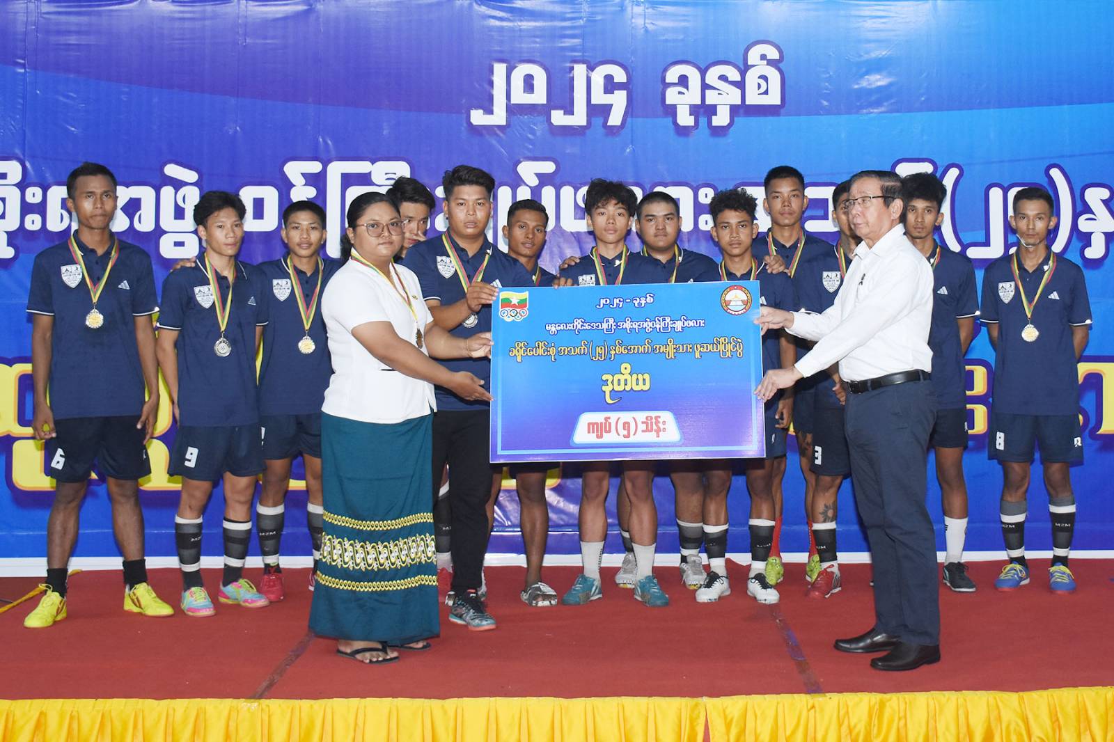 ၂၀၂၄ ခုနှစ် မန္တလေးတိုင်းဒေသကြီးအစိုးရအဖွဲ့ဝန်ကြီးချုပ်ဖလား ခရိုင်ပေါင်းစုံ အသက် ၂၅ နှစ်အောက် (အမျိုးသား) ဖူဆယ်ဘောလုံးပြိုင်ပွဲ ဗိုလ်လုပွဲနှင့် ဆုချီးမြှင့်ပွဲ အခမ်းအနားကို ယမန်နေ့နံနက်ပိုင်းက မန္တလာသီရိအားကစားကွင်း Multipurpose Stadium တွင်ကျင်းပရာ မန္တလေးတိုင်းဒေသကြီးအစိုးရအဖွဲ့ဝန်ကြီးချုပ် ဦးမျိုးအောင်၊ တိုင်းဒေသကြီး တရားလွှတ်တော်တရားသူကြီးချုပ် ဒေါ်ခင်သင်းဝေ၊ တိုင်းဒေသကြီးအစိုးရအဖွဲ့ဝင်ဝန်ကြီးများ၊ ဌာနဆိုင်ရာတာဝန်ရှိသူများ၊ တိုင်းဒေသကြီးဖူဆယ်ဘောလုံးဆပ်ကော်မတီမှ တာဝန်ရှိသူများ၊ ခရိုင် ၁၁ ခုမှ ပြိုင်ပွဲဝင်အားကစားသမားများ၊ အုပ်ချုပ်သူ၊ နည်းပြများ၊ အားကစားဝါသနာရှင်များနှင့် ဖိတ်ကြားထားသူများ တက်ရောက်ကြည့်ရှုအားပေးကြသည်။