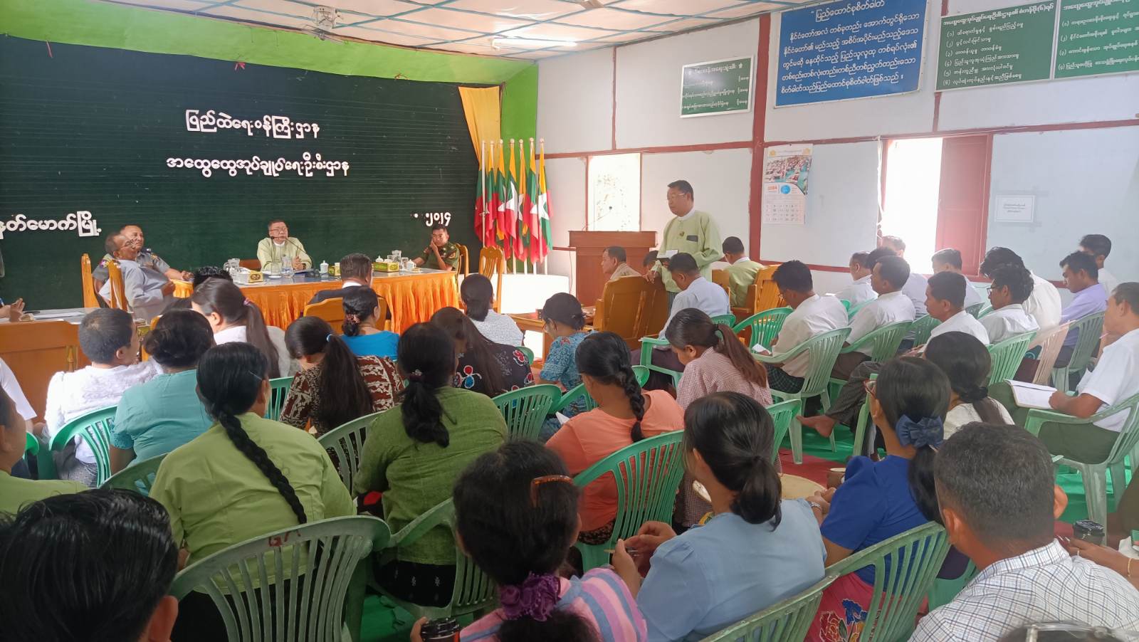 ရှေးဦးစွာ မြို့နယ်စီမံအုပ်ချုပ်ရေးအဖွဲ့ဥက္ကဋ္ဌ မြို့နယ်အုပ်ချုပ်ရေးမှူး ဦးသန့်စင်က မြို့တွင်းသန့်ရှင်းရေးကို စနစ်တကျပြုလုပ်ရန်၊ မိုးရာသီရောက်ရှိလာပြီဖြစ်တဲ့အတွက် လမ်းဘေးဝဲယာရှိ ရုံးများအနေဖြင့် မိမိတို့၏ ရုံးမျက်နှာစာများတွင် ပေါင်းမြက်များရှင်းလင်းထားရန်၊ ရေနုတ်မြောင်း များမှ ရေကြီးရေလျှံမှု မဖြစ်ပေါ်စေရေး ပိတ်ဆို့နေသော အမှိုက်သရှိုက်များ၊ မြက်ပင်၊ နွယ်ပင်များ ရှင်းလင်းထားရန်၊ မြို့နယ်ပြန်ကြားရေးနှင့်ပြည်သူ့ဆက်ဆံရေးဦးစီးဌာနသို့ ဌာနဆိုင်ရာများအနေဖြင့် စာအုပ်စာစောင်များ စုပေါင်းလှူဒါန်းပေးစေလိုပါကြောင်း၊ ကျောင်းဖွင့်ရာသီရောက်ရှိလာပြီဖြစ်တဲ့အတွက် အခြေခံပညာရေးကျောင်းများမှ မိမိကျောင်းရှိ ကျောင်းသား/သူများ ကျန်းမာရေး ညီညွတ်စေရေး ခြင်၊ ယင်၊ ပိုးလောက်လမ်းများ ခိုအောင်းနိုင်သော နေရာများအား သန့်ရှင်းရေး ဆောင်ရွက်ရန်၊ မိမိလုံခြုံရေးနှင့် ရုံးလုံခြုံရေးအတွက် အထူးဂရုပြုဆောင်ရွက်ရန်နှင့် နယ်မြေလုံခြုံ ရေးကိစ္စများ၊ ဌာနဆိုင်ရာ တာဝန်ရှိသူများအနေဖြင့် နယ်မြေကွင်းဆင်းရာတွင် သက်ဆိုင်ရာဌာနများ နှင့် ပူးပေါင်းဆောင်ရွက်ကြရန်တို့ကို ဆွေးနွေးပြောကြားခဲ့သည်။ ထို့နောက် ဌာနဆိုင်ရာများက လည်း မိမိတို့ဌာနအလိုက် တင်ပြဆွေးနွေးခဲ့ပြီး မြို့နယ်စီမံအုပ်ချုပ်ရေးအဖွဲ့ဥက္ကဋ္ဌက တင်ပြချက် များကို ပြန်လည်ဆွေးနွေးခဲ့ကြောင်း သိရသည်။