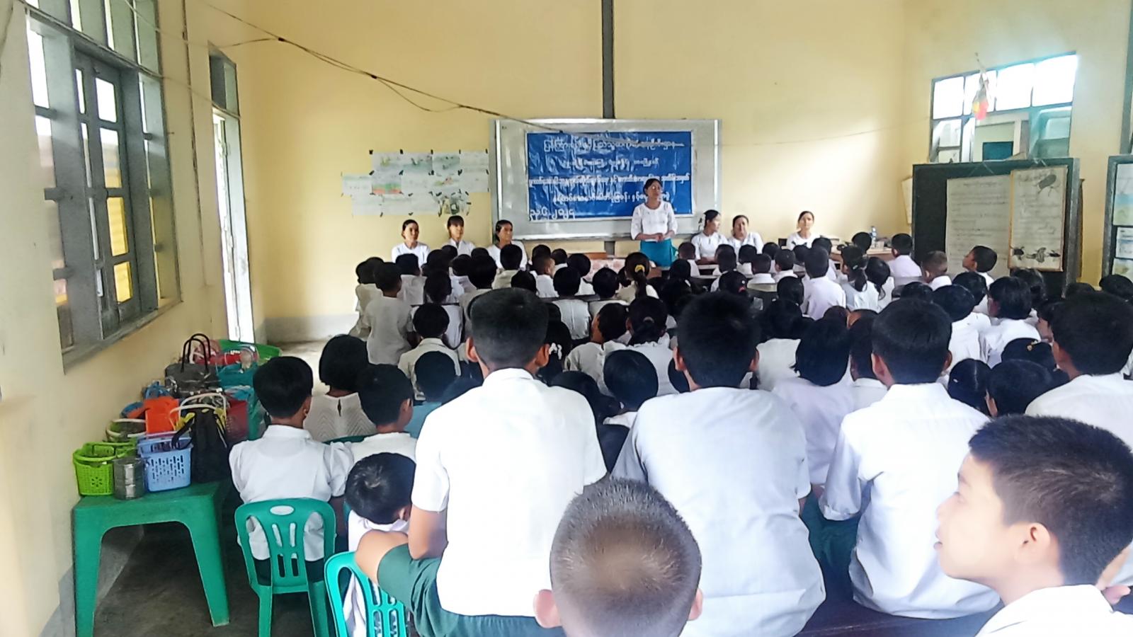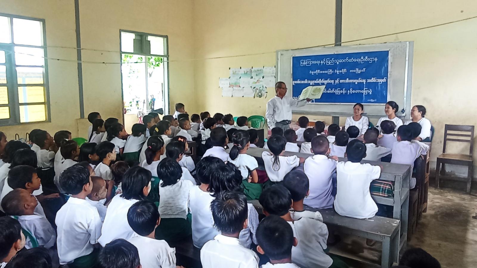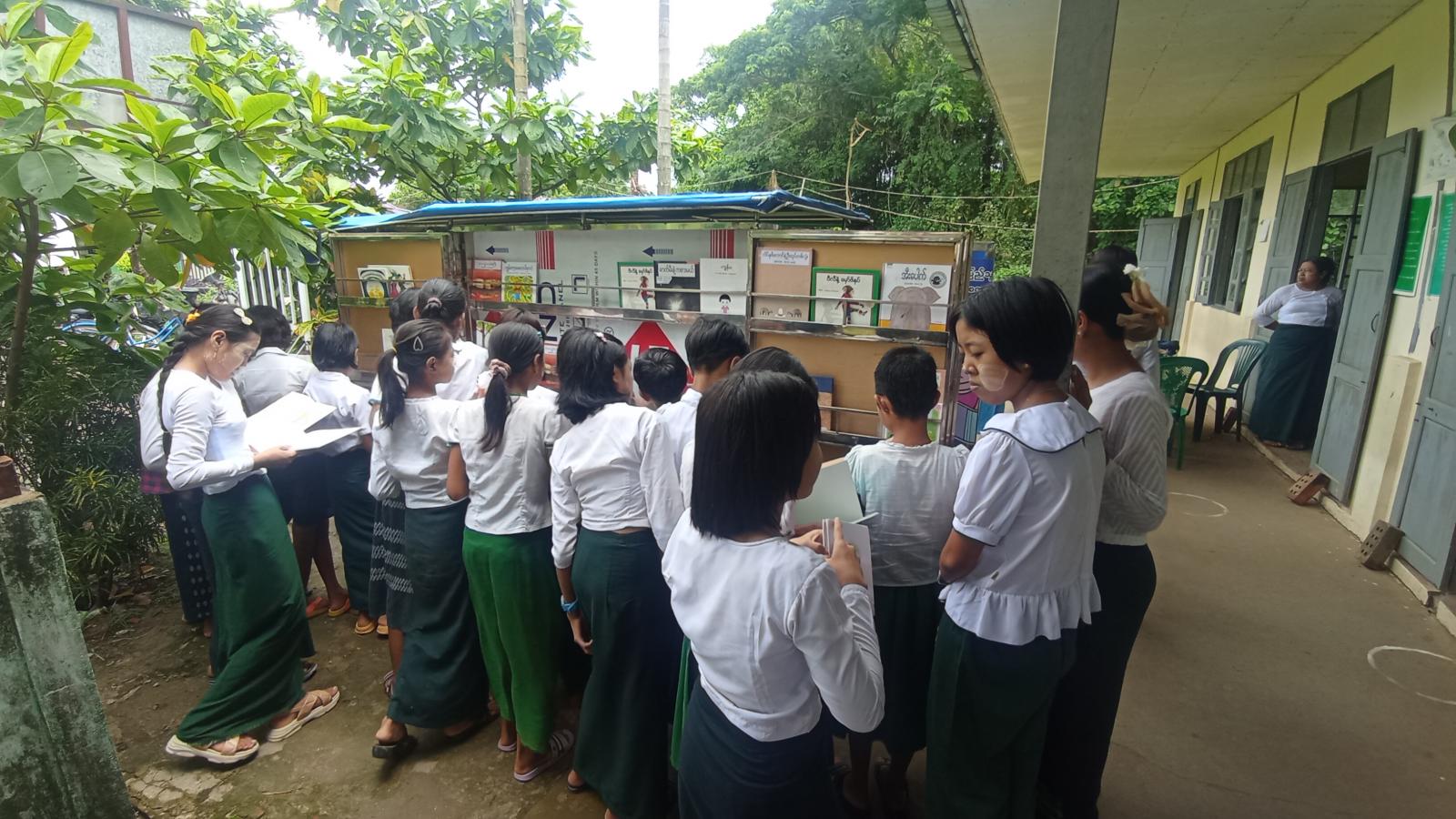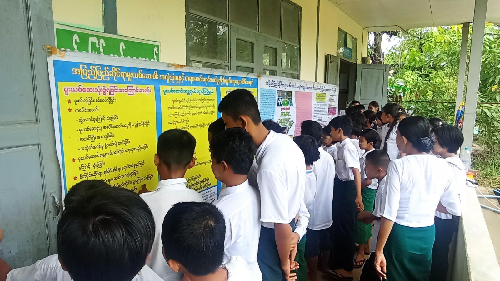 ထို့နောက် ပြန်ကြားရေးနှင့်ပြည်သူ့ဆက်ဆံရေးဦးစီးဌာနမှ စာဖတ်ရှိန်မြှင့်တင်ရေးနယ်လှည့် စာကြည့်တိုက်အဖြစ် ဦးစီးအရာရှိ ဒေါ်သန်းသန်း၀င်းနှင့် ဝန်ထမ်းများက ကျောင်းသား/ကျောင်းသူများအား အသိပညာတိုးပွားစေမည့် ရုပ်ပုံပြဇာတ်နှင့်ရုပ်ပုံပါ ပုံပြင်စာအုပ်များဖြင့် ပုံပြင်ပြောပြခြင်း၊ စာအုပ်များအားဖတ်ရှုစေခြင်းနှင့် မူးယစ်ဆေးဝါးအသိပညာပေးနံရံကပ်စာစောင်များကိုပြသခဲ့ရာ ကျောင်းသား/ ကျောင်းသူများက စိတ်ပါ၀င်စားစွာ ကြည့်ရှုလေ့လာကြကြောင်း သိရသည်။
