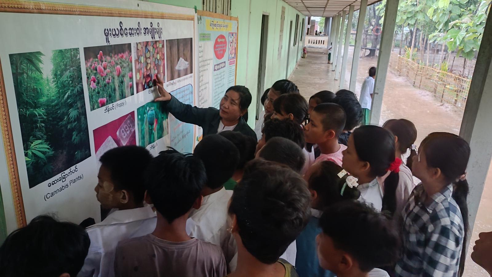 ထိုသို့ကွင်းဆင်းဆောင်ရွက်ရာ မြို့နယ်ပြန်ကြားရေးနှင့်ပြည်သူ့ဆက်ဆံရေးဦးစီးဌာန၊ ဦးစီးအရာရှိ ဒေါ်သော်ဇင်အောင်က မူးယစ်ဆေးဝါးအန္တရာယ်အကြောင်း အသိပညာပေး ဆွေးနွေးပြီး ရှန်တီစေတနာ့ဝန်ထမ်းအဖွဲ့မှ လှူဒါန်းသည့် စက္ကူပြဇာတ်ဖြင့် ပုံပြင်ပြောခြင်းများ ဆောင်ရွက်သည်။