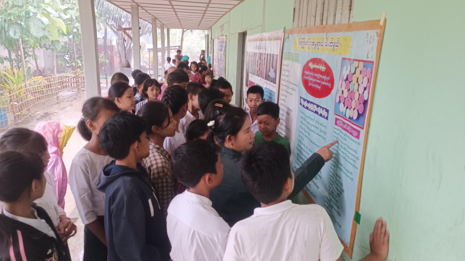 ထို့နောက် မြို့နယ်ပြန်ကြားရေးနှင့်ပြည်သူ့ဆက်ဆံရေးဦးစီးဌာနမှ ပြသသည့် မူးယစ်ဆေးဝါးအန္တရာယ်၊ လူကုန်ကူးခြင်းခံရမှုမှ ကာကွယ်နည်းများ၊ ယာဥ်စည်းကမ်း၊ လမ်းစည်းကမ်း သိမှတ်ဖွယ်ရာများ၊ ကလေးအလုပ်သမားပပျောက်ရေးဆိုင်ရာများ စသည့် နံရံကပ်စာစောင်များပြသရာ ကျောင်းသား၊ ကျောင်းသူများက လေ့လာကြည့်ရှုကြကြောင်း သိရသည်။