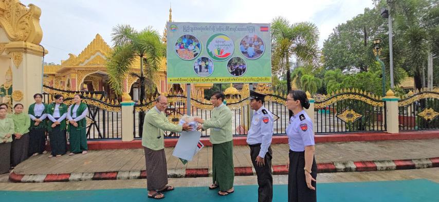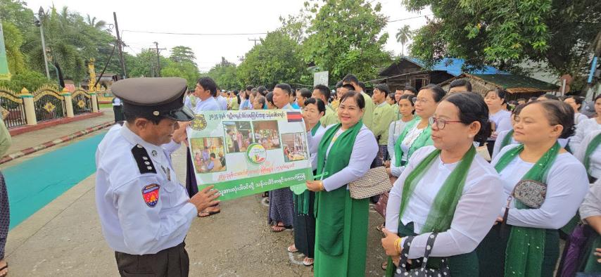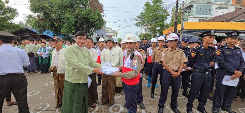 ထို့နောက် သန်းခေါင်စာရင်းကောက်ယူနိုင်ရေး အထိမ်းအမှတ်တီရှပ်၊ စပို့ရှပ်၊ ဦးထုပ်နှင့် အသိပညာပေး လက်ကမ်းစာစောင်များကို ခရိုင်အုပ်ချုပ်ရေးမှူးက ပြည်သူများကိုယ်စား အမှတ်(၅) ရပ်ကွက် အုပ်ချုပ်ရေးမှူးထံသို့ ပေးအပ်ခဲ့ပြီးလူဝင်မှုကြီးကြပ်ရေးနှင့်ပြည်သူ့ အင်အားဝန်ကြီးဌာန ခရိုင်ဦးစီးမှူးက အသင်းအဖွဲ့များကိုယ်စား မြို့နယ်မိခင်နှင့်ကလေး စောင့်ရှောက်ရေးအသင်းအဖွဲ့ဝင် တစ်ဦးထံသို့ ပေးအပ်ခဲ့သည်။ ဆက်လက်၍ အသိပညာပေးလက်ကမ်းစာစောင်များကို တာဝန်ရှိသူများက တက်ရောက်လာသော ပြည်သူများထံသို့ တစ်ဦးချင်း လိုက်လံပေးဝေခဲ့ကြကြောင်းသိရသည်။