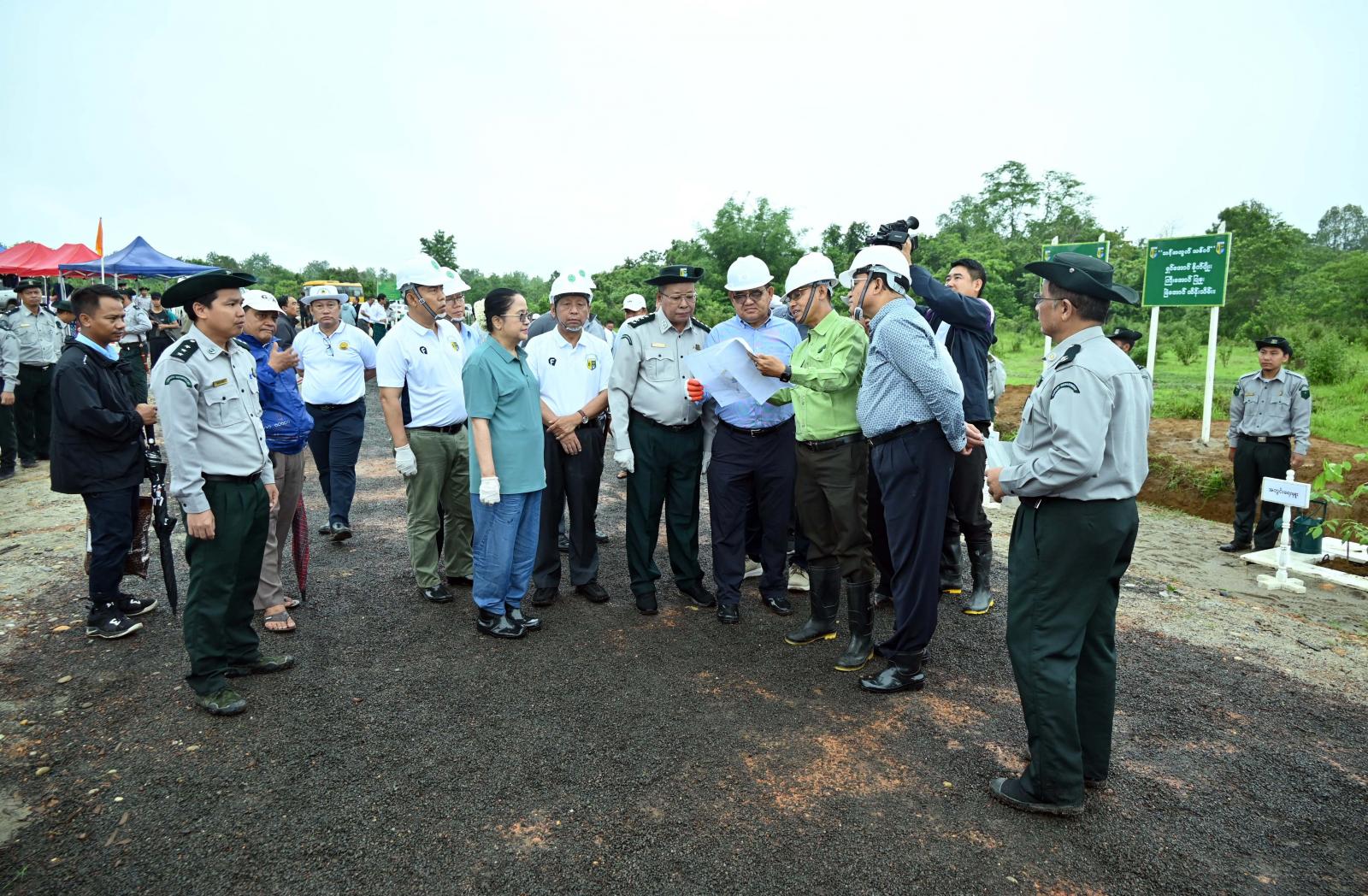 ထိုမှတစ်ဆင့် ပြည်နယ်ဝန်ကြီးချုပ်နှင့် အဖွဲ့ဝင်များသည် ရွှေအိုက် (ရွှေပြည်သာရပ်ကွက်) အတွင်း ရွှေပြည်သာ-အားဆာကျေးရွာသွား ကားလမ်းဘေးရှိ မြေဧရိယာ (၈)ဧကပေါ်တွင် မြို့နယ် စည်ပင်သာယာရေးအဖွဲ့က မြို့တွင်းကုန်တင်ယာဉ်ကြီးများ ဖြတ်သန်းသွားလာမှုမရှိစေရေးနှင့် ယာဉ် ကြောပိတ်စို့မှု၊ ယာဉ်အန္တရာယ်ကင်းဝေးရေးအတွက် ကုန်တင်ယာဉ်ကြီးများ ရပ်နားစခန်းသစ်တည် ဆောက်နိုင်ရေး မြေနေရာပြုပြင်ဆောင်ရွက်နေမှု အခြေအနေများ၊ ကုန်တင်ယာဉ်ရပ်နားစခန်း အတွင်း တည်ဆောက်သွားမည့် အဆောက်အအုံများ၊ အရှည် ၂၈၉၀ ပေရှိ ခြံစည်းရိုးအား ချိန်းလင့် ကာရံသွားမည့် အစီအစဉ်များနှင့် စပ်လျဉ်း၍ တာဝန်ရှိသူများ၏ ရှင်းလင်းတင်ပြမှုအပေါ် ပြည်နယ် ဝန်ကြီးချုပ်က ပေါင်းစပ်ညှိနှိုင်းဆောင်ရွက်ပေးခဲ့ပြီး မြေဧရိယာအား ရှင်းလင်း၍ သဲကျောက်ခင်းကျင်း ထားရှိမှုအခြေအနေများကို ကြည့်ရှုစစ်ဆေးခဲ့ကြသည်။