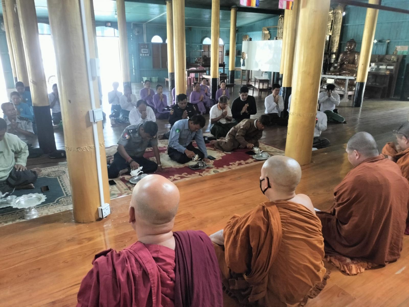 ထို့နောက် ဧည့်ပရိသတ်အပေါင်းတို့မှ မွေတော်ပရိယတ္တိစာသင်တိုက်၊ မြို့နယ်သံဃနာယက အဖွဲ့အကျိုးတော်ဆောင်ဆရာတော်ထံ (၅)ပါးသီလ ခံယူတည်ဆောက်ခဲ့ကြပြီး ဆရာတော်၊ သံဃာတော် အရှင်သူမြတ်တို့ ရွတ်ပွားသရဇ္ဇျယ်တော်မူတော် ပရိတ်တရာတော်များနာယူခဲ့ကာ လှူဖွယ်ဝတ္ထုပစ္စည်းများ ဆက်ကပ်လှူဒါန်း၍ လှူဒါန်းမှုအစုစုတို့အတွက် ရေစက်သွန်းချအမျှပေး ဝေခဲ့ကြသည်။