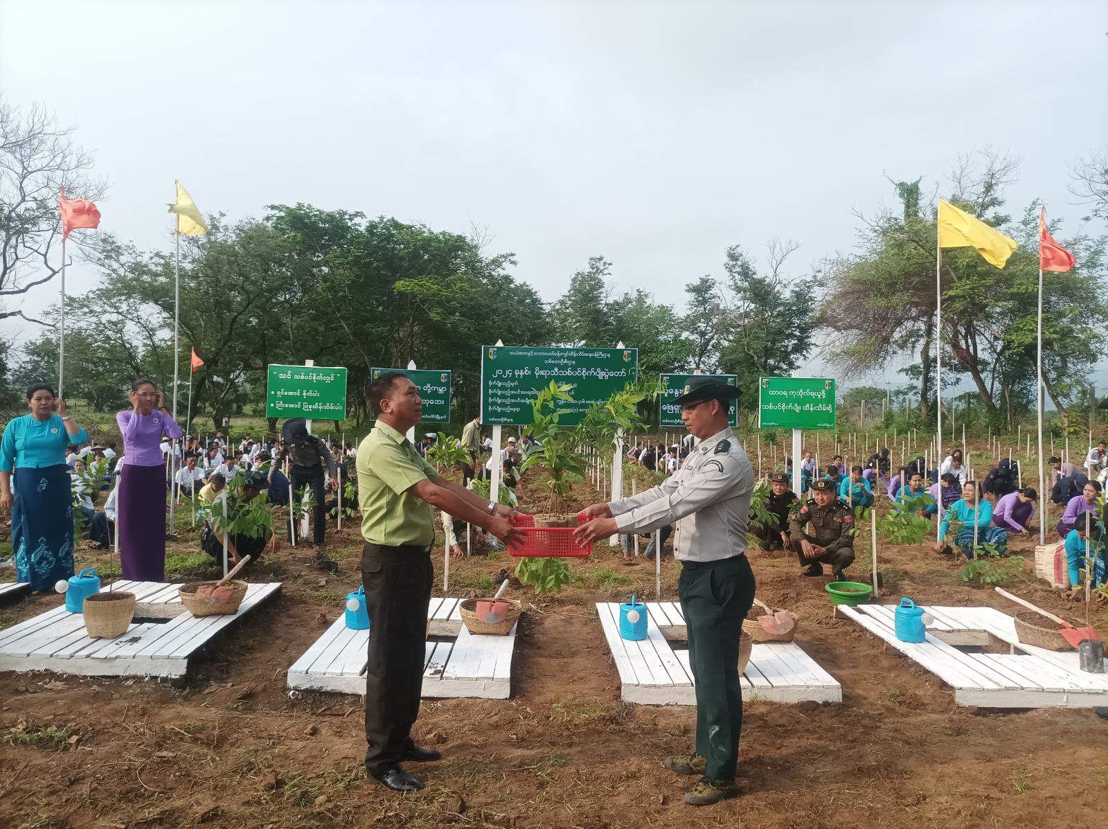 ရှေးဦးစွာ မြို့နယ်စီမံအုပ်ချုပ်ရေးအဖွဲ့ဥက္ကဋ္ဌ ဦးချန်ဖီယာန်နှင့် မြို့နယ်သစ်တောဦးစီးဌာနမှ ဦးစီးအရာရှိ ဦးရဲအောင်တို့က တာဝန်ရှိသူများအား ပျိုးပင်များ ပေးအပ်၍ စုပေါင်းသစ်ပင်စိုက်ပျိုးပွဲကို ကျင်းပခဲ့ကြသည်။