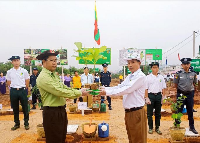 သစ်ပင်စိုက်ပျိုးရေးပွဲတော်၌ မြို့နယ်စီမံအုပ်ချုပ်ရေးအဖွဲ့ဉက္ကဋ္ဌ ဦးစိုးမင်းအောင်နှင့်အဖွဲ့ဝင်များ၊ မြို့နယ်သစ်တောဦးစီးဌာန တောအုပ်ကြီးဦးဂွမ်ဆန်အောင်တို့က ဌာနဆိုင်ရာတာဝန်ရှိသူများနှင့် ဒေသခံပြည်သူများထံ ပျိုးပင်များပေးအပ်သည်။