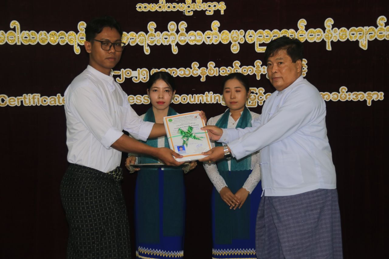 ထို့နောက် သမဝါယမစာရင်းရေးစာရင်းကိုင် သက်မွေးပညာသင်တန်းကျောင်း ကျောင်းအုပ်ကြီးက လုပ်ငန်းဆိုင်ရာကိစ္စရပ်များနှင့် ပတ်သက်၍ ရှင်းလင်းတင်ပြပြီး ၂၀၂၃ -၂၀၂၄ ပညာသင်နှစ်တွင် သင်တန်းပြီးမြောက် အောင်မြင်ခဲ့သော သင်တန်းသား/သူများအား Certificate in Business Accounting အောင်လက်မှတ်ကို ပြည်နယ်လမ်းပန်း ဆက်သွယ်ရေးဝန်ကြီး ဦးတင်စန်းနိုင်က ပေးအပ်ချီးမြှင့်ခဲ့ရာ သင်တန်းသားတစ်ဦးက လက်ခံရယူခဲ့သည်။