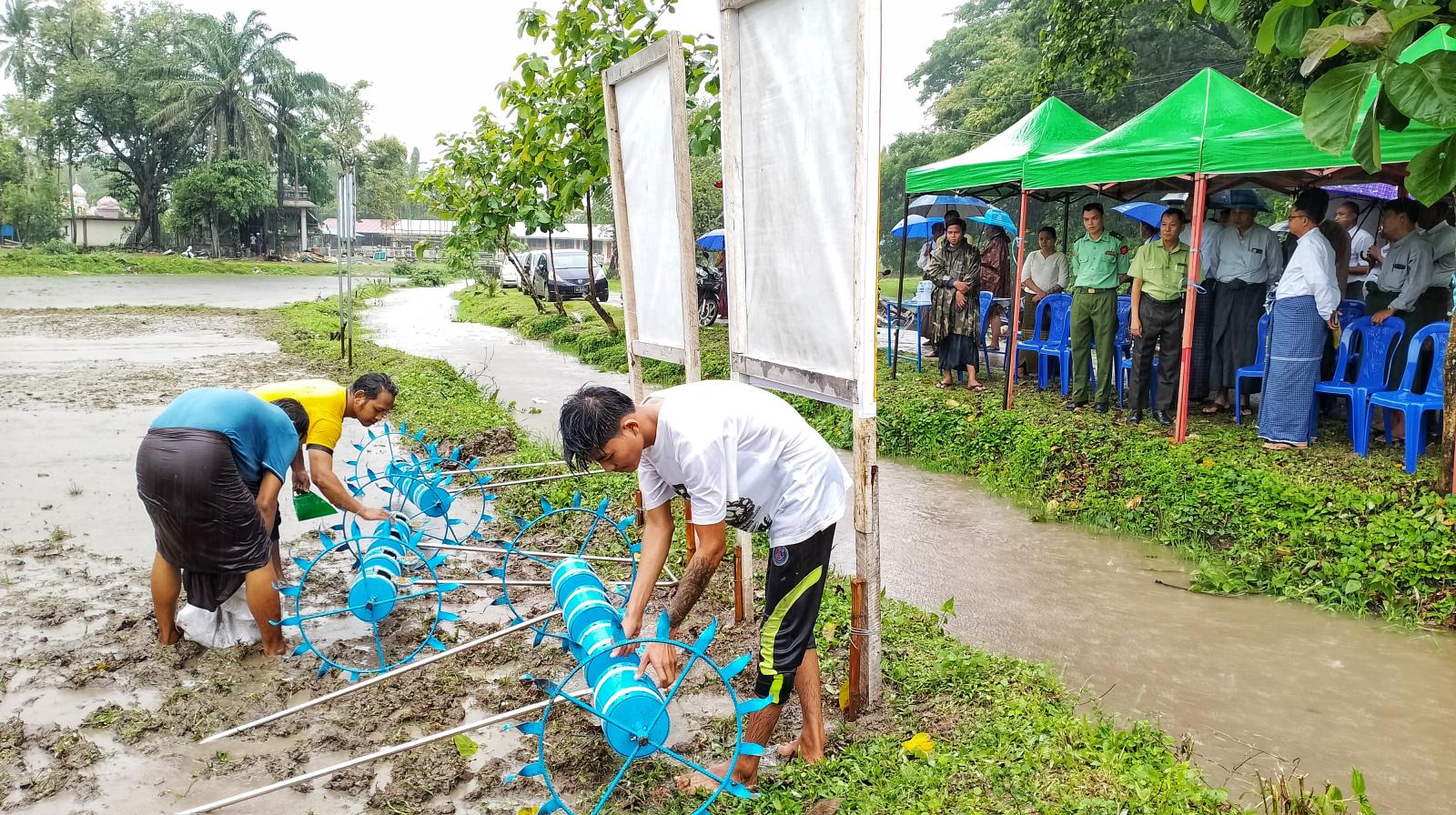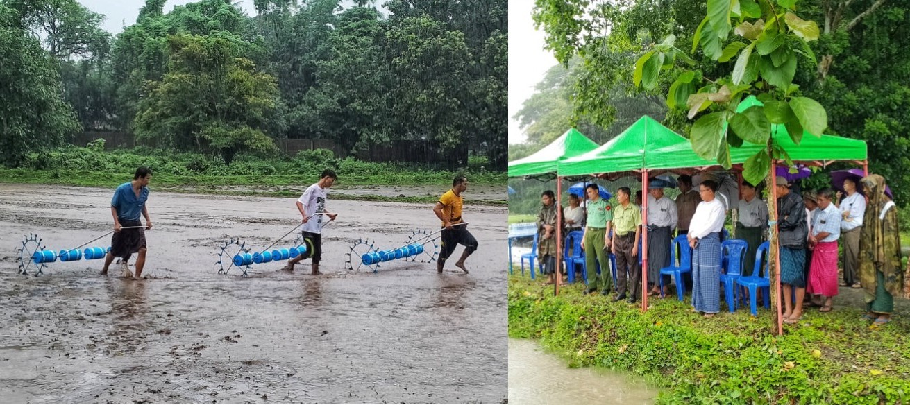 မွန်ပြည်နယ် မုဒုံမြို့နယ် ကျောက်တလုံးကျေးရွာအုပ်စုတွင် မိုးစပါးမျိုးစေ့ချ ကိရိယာ (Seeder) ဖြင့် တိုက်ရိုက်စိုက်ပျိုးခြင်း ကွင်းသရုပ်သပြပွဲကို ယမန်နေ့က တောင်သူ ဦးသန်းထိုက် ကွင်းအမှတ် (၈၂၈) လယ်ယာမြေ၌ ကျင်းပသည်။