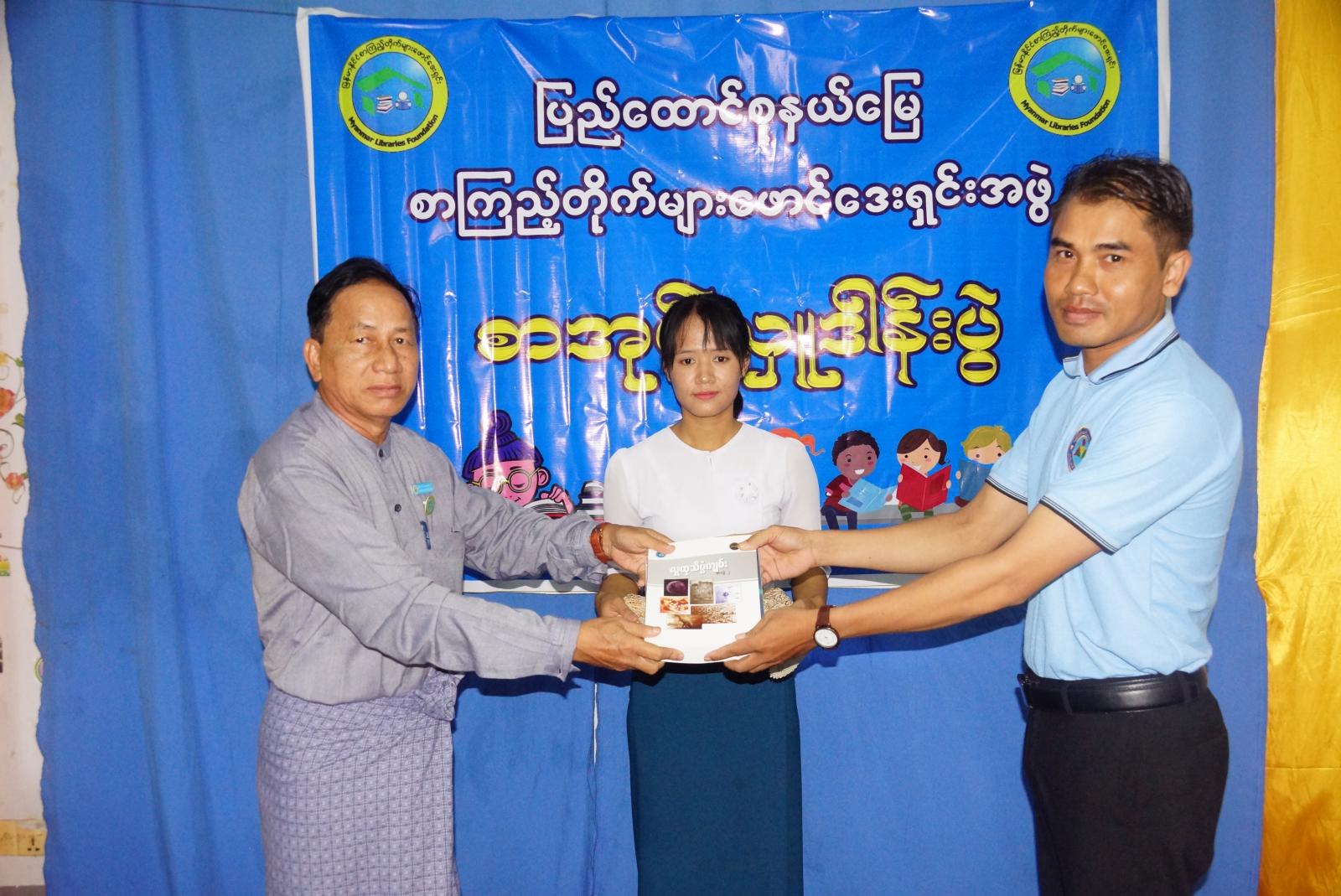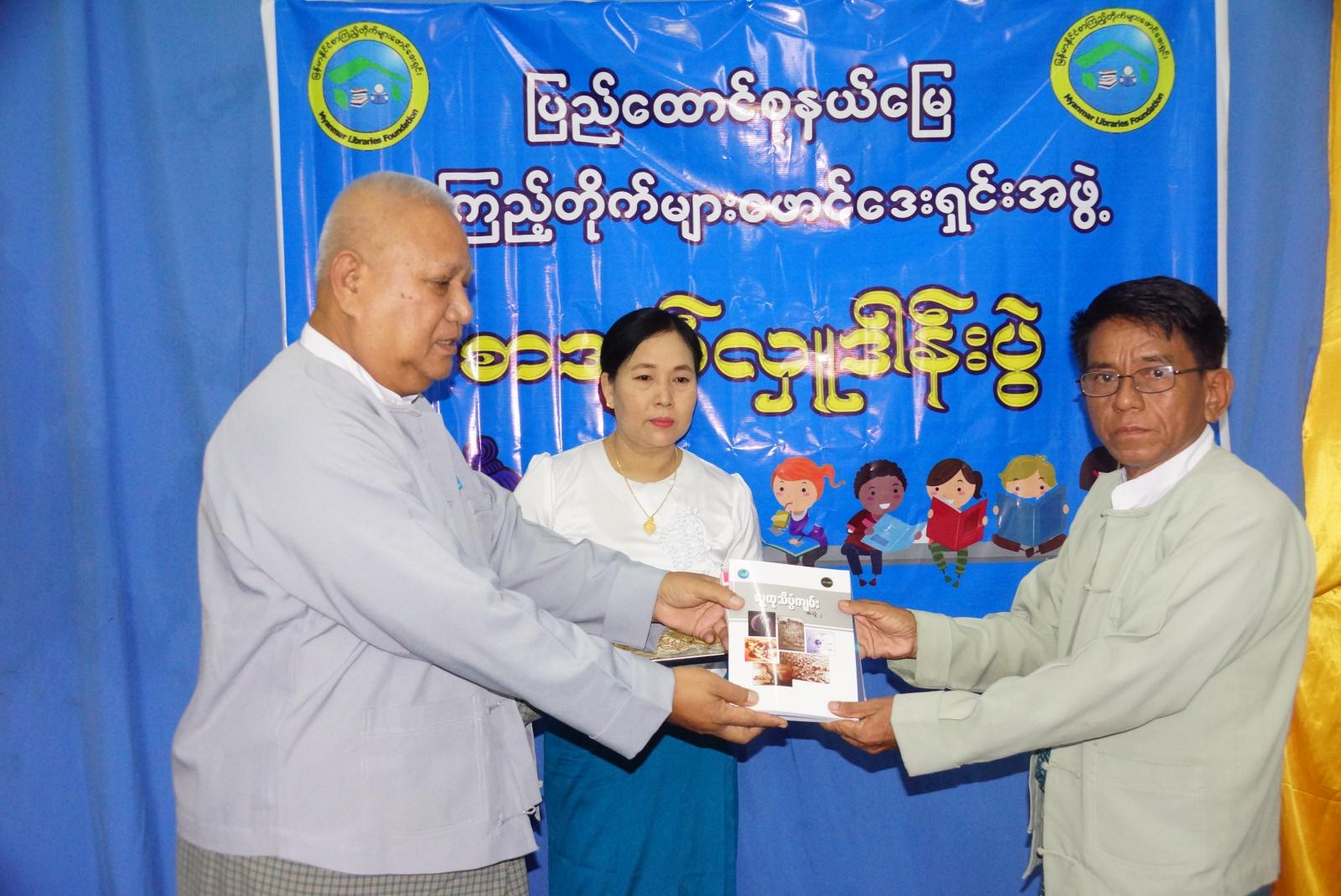 ယင်းနောက် မြန်မာနိုင်ငံစာကြည့်တိုက်များ ဖောင်ဒေးရှင်းမှပေးပို့သည့် စာအုပ်များမှ ဇမ္ဗူသီရိမြို့နယ်အတွင်းရှိ ရပ်ကွက်/ကျေးရွာ စာကြည့်တိုက်ရှစ်တိုက်အတွက် လူထုသိပ္ပံကျမ်း (အတွဲ-၁၊ အတွဲ-၂၊ အတွဲ-၃) စာအုပ် (၂၄) အုပ်ကို ပြည်ထောင်စုနယ်မြေ စာကြည့်တိုက်များဖောင်ဒေးရှင်းဥက္ကဋ္ဌနှင့် တာဝန်ရှိသူများက ပေးအပ်လှူဒါန်းရာ ရပ်ကွက်/ကျေးရွာ စာကြည့်တိုက်မှူးများက လက်ခံရယူခဲ့သည်။