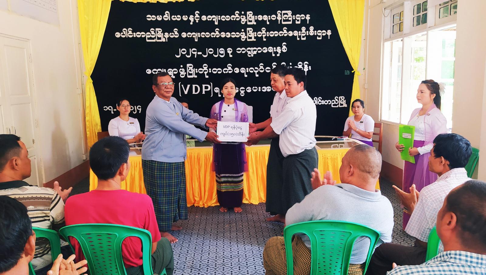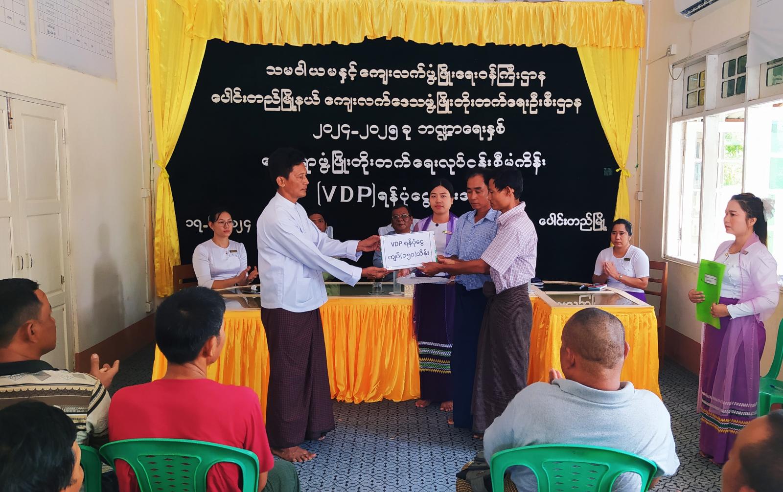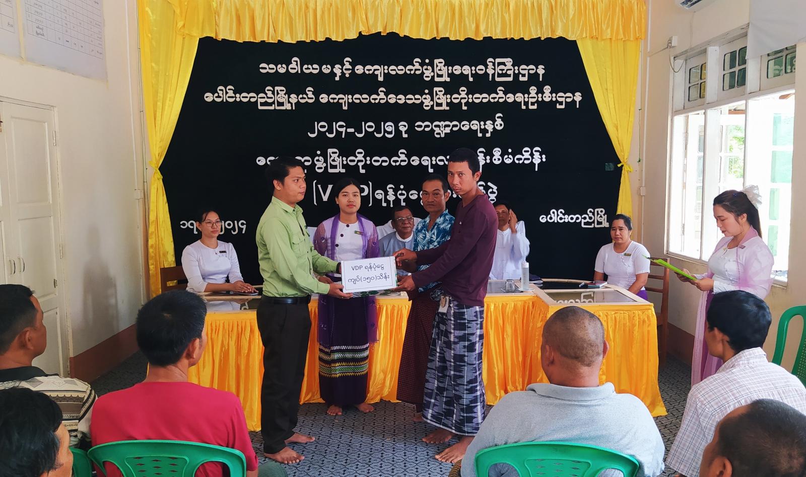 ထို့နောက် ကျေးရွာ (၆) ရွာတွင် ကွန်ကရစ်လမ်းခင်းကျင်းရန်၊ ကျေးရွာ (၃) ရွာတွင် မြေနီကျောက်ရောလမ်းခင်းကျင်းရန်နှင့် ထိုကျေးရွာ (၉) ရွာတွင် ရေသန့်စင်စနစ် ကောင်အထည်ဖော် လုပ်ငန်းဆောင်ရွက်ရန်တို့အတွက် နိုင်ငံတော်မှ ထောက်ပံ့သည့် ရန်ပုံငွေများကို တာဝန်ရှိသူများက တက်ရောက်လာသော ကျေးရွာကိုယ်စားလှယ်များထံ အသီးသီး လွှဲပြောင်းပေးအပ်ခဲ့ကြသည်။