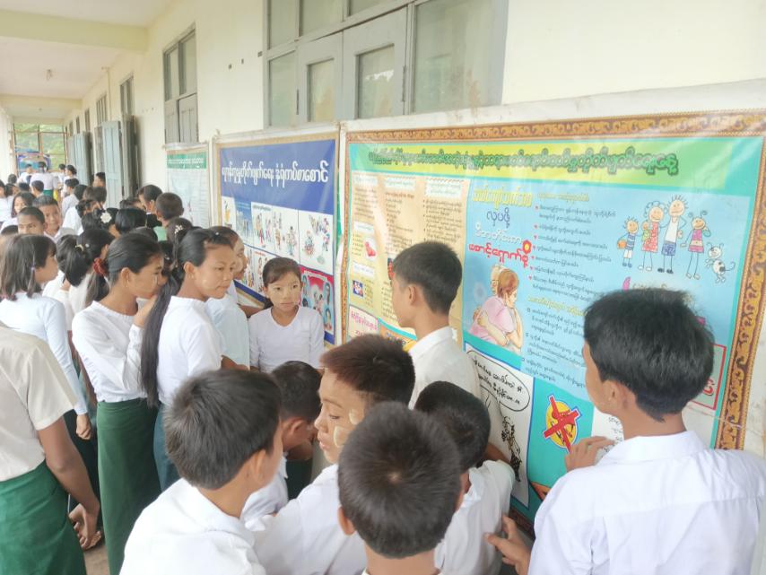 ထို့နောက် ပြန်ကြားရေးနှင့်ပြည်သူ့ဆက်ဆံရေးဦးစီးဌာနမှ ကျောင်းသူ၊ ကျောင်းသားများ ဖတ်ရှုလေ့လာနိုင်ရန် ကလေးကဗျာများ၊ ရုပ်ပြပုံပြင်များ၊ စာစောင်များ စသည့် ကလေးများ အသိပညာတိုးပွားရေး စာအုပ်စာပေများနှင့် စာဖတ်ရှိန်မြှင့်တင်ရေး၊ မူးယစ်ဆေးဝါးအန္တရာယ် သတိပြုကာကွယ်ရေး စသည့် အသိပညာပေး နံရံကပ်စာစောင်များတို့ကို ခင်းကျင်းပြသရာ ကျောင်းသား၊ ကျောင်းသူများမှ စိတ်ပါဝင်စားစွာ ကြည့်ရှုလေ့လာခဲ့ကြောင်း သိရသည်။